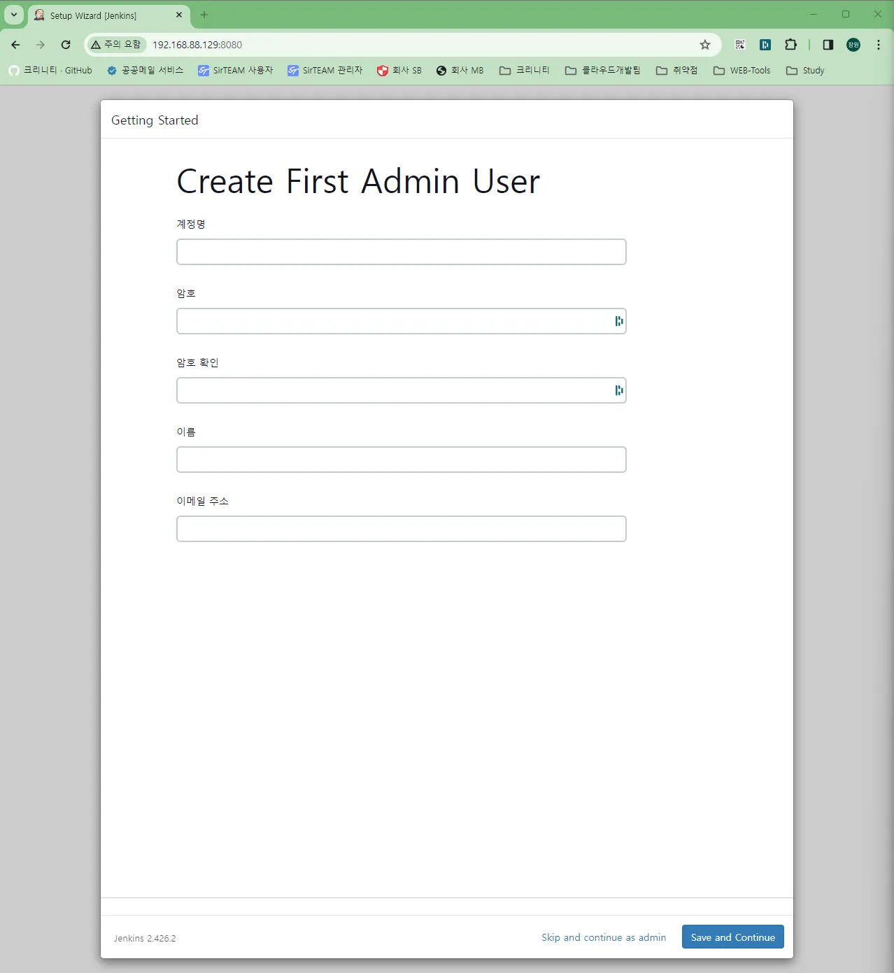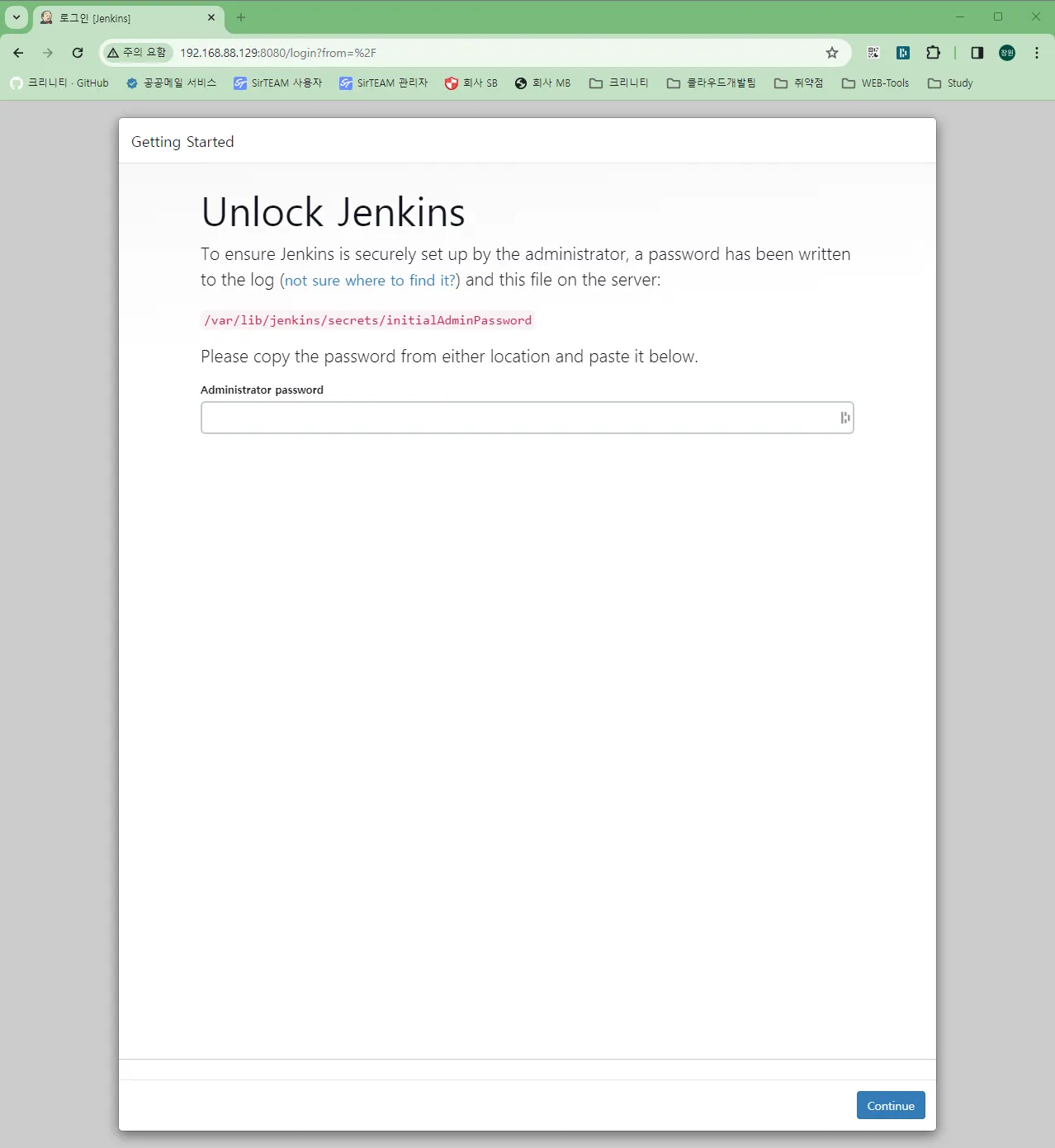 Jenkin 서버에 저장되어 있는 기본 비밀번호를 입력하여 관리자 계정을 활성화 합니다.