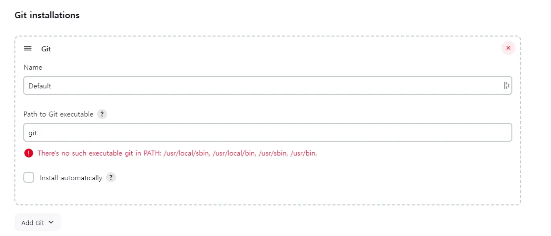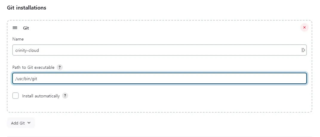 Name 란에 적당한 값을 넣고, 서버에 설치된 git 의 경로를 입력 후, Save 합니다.