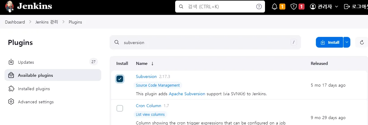 젠킨스 서버에서 소스를 체크아웃 받고, 빌드를 할 수 있도록 개발 도구를 설정하는 메뉴입니다.