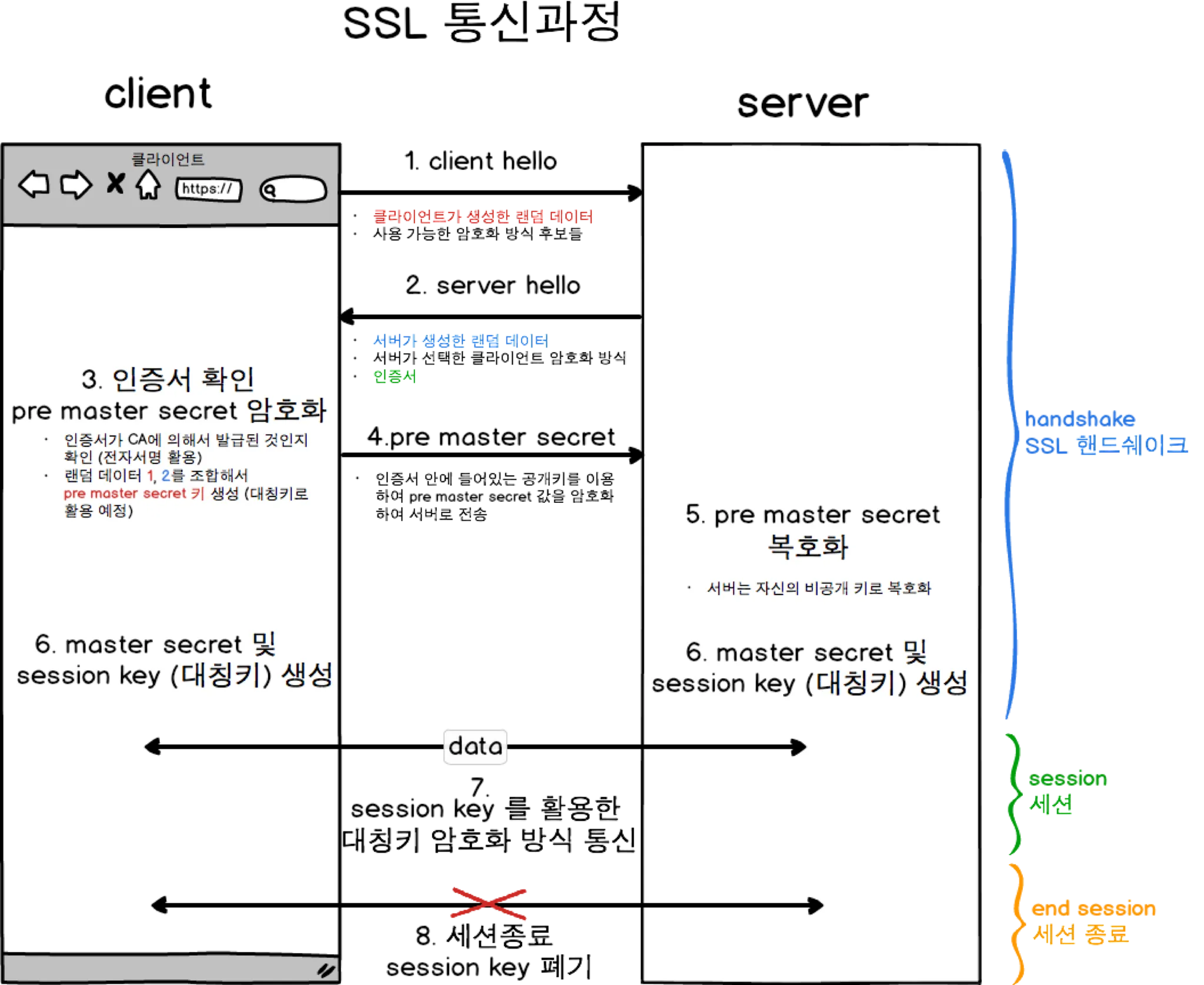 전달 받은 인증서의 유효성 검증 및 클라이언트와 서버가 생성한 랜덤 데이터를 조합 하여,