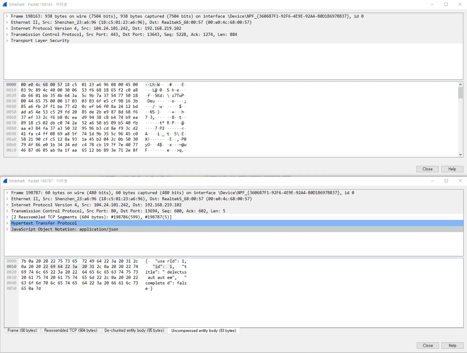 위가 HTTPS 패킷(198163), 아래가 HTTP 패킷(198787)