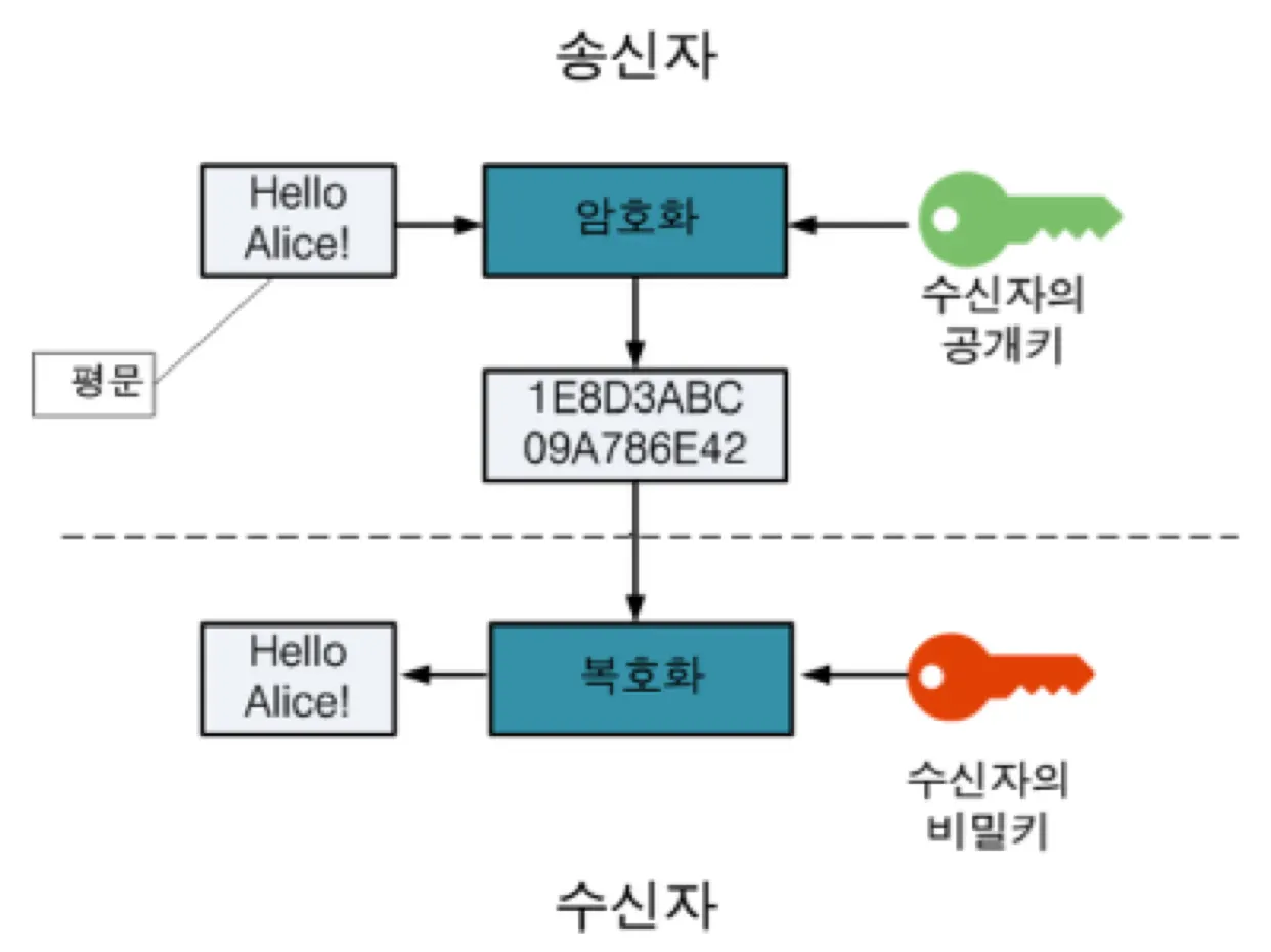 암호화할 때의 키는 공개키(public key), 복호화할 때의 키는 개인키(private key)