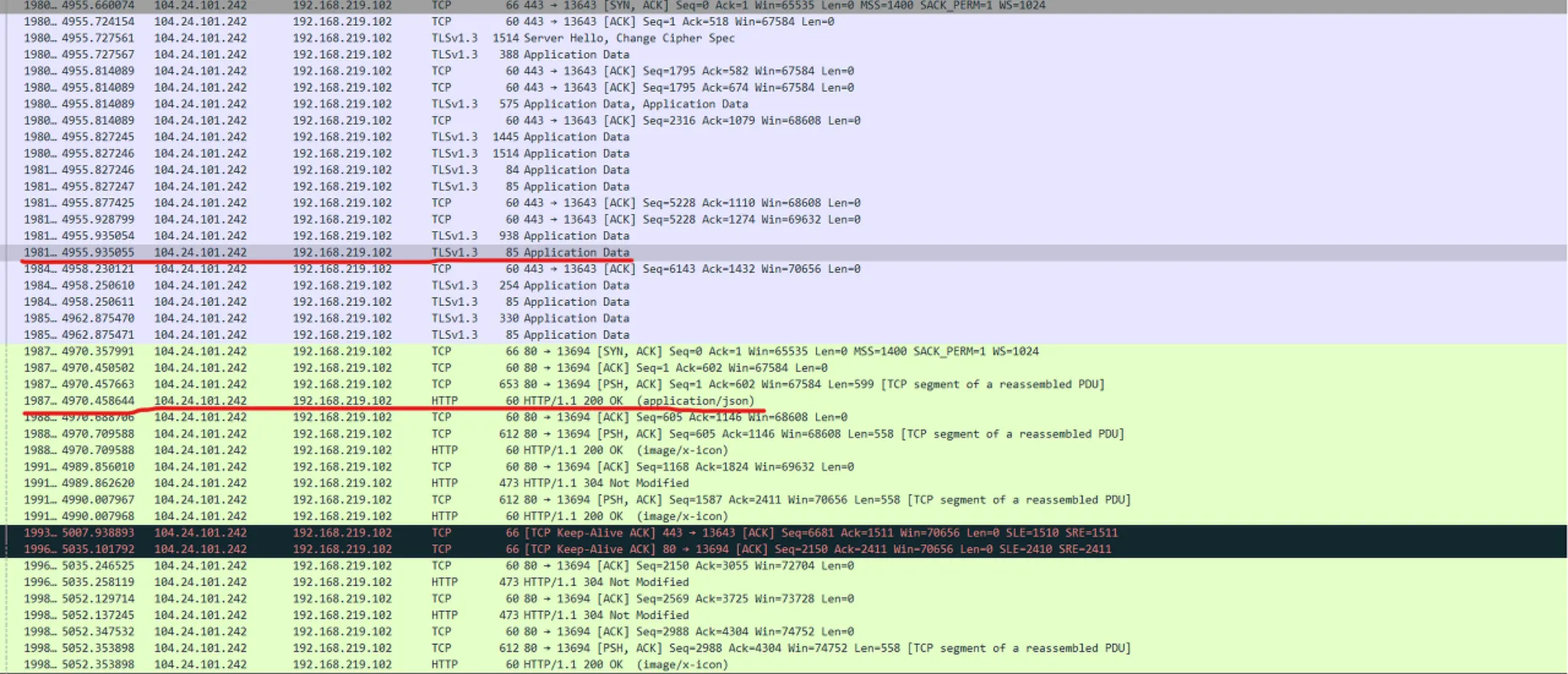 보라색 부분이 HTTPS 통신 패킷, 연두색 부분이 HTTP 통신 패킷