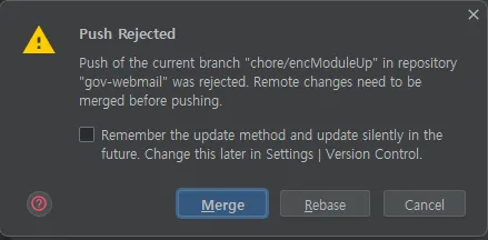 Force Push가 아닌 Push를 하였을 때, 아래와 같은 경고창을 확인 할 수 있다.