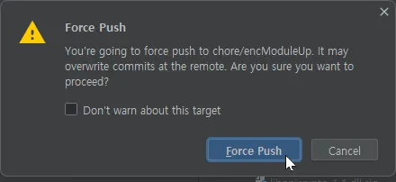 이미 오리진 브랜치에 Push가 된 두 개의 커밋이 새로 합친 커밋으로 덮어써지기 때문에 경고가 출력된다.