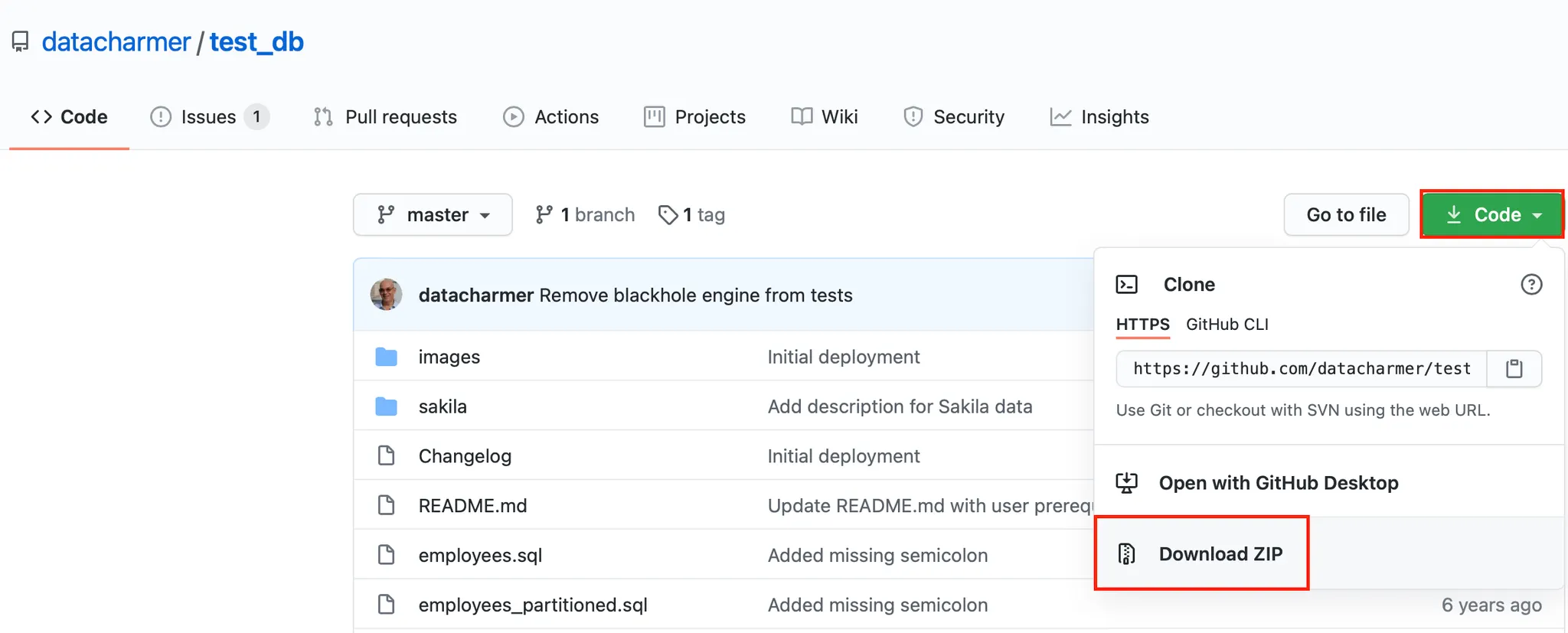 깃허브에 접속하여 샘플 데이터베이스를 내려 받은 후, 본인 로컬 DB에 Import 해서 사용하는 방법을 소개하겠다.