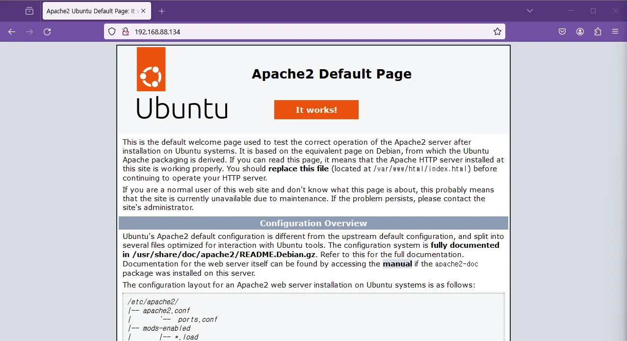 브라우저에서 접속시 Apache 기본 페이지가 나온것을 확인하였습니다.