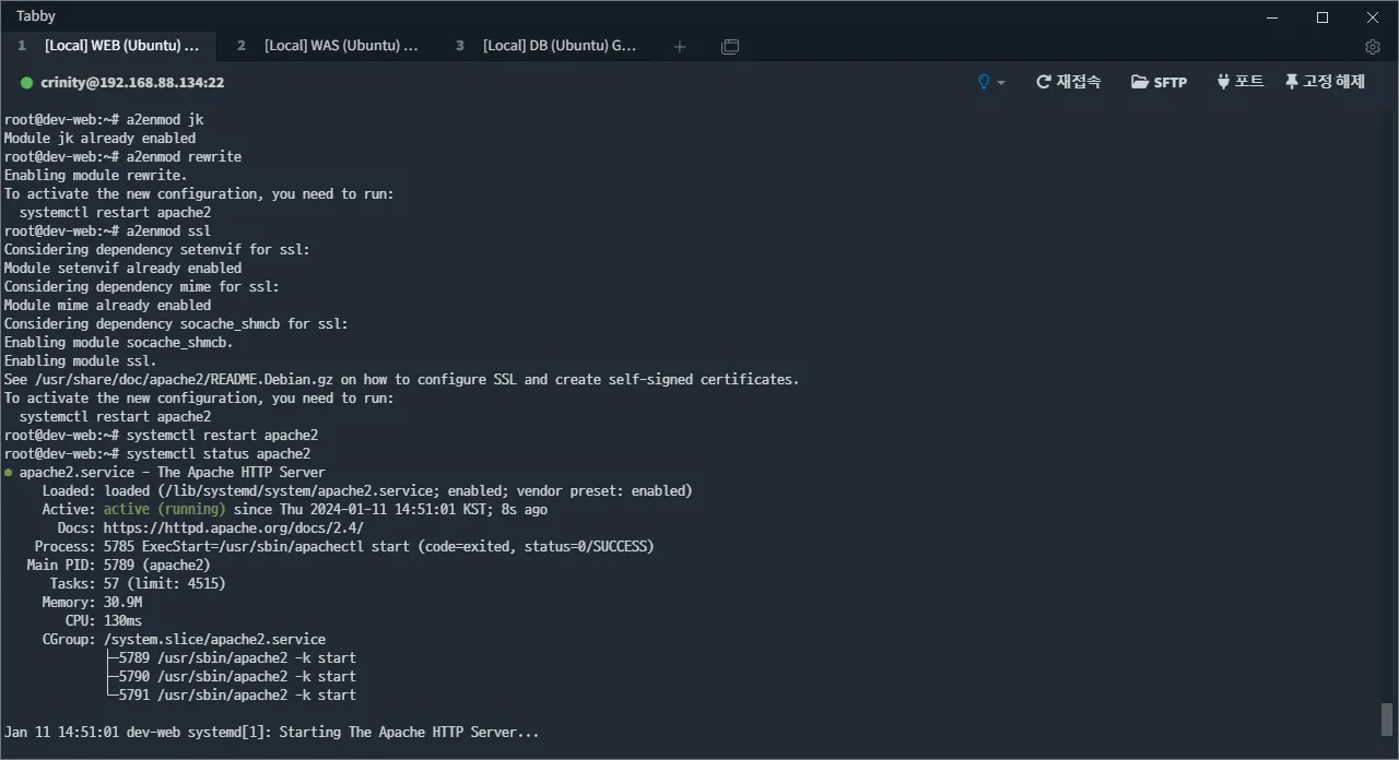 아래 명령어로 각 모듈을 활성해줍니다. ssl 모듈의 경우 재시작을 하라고 하네요.