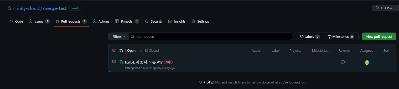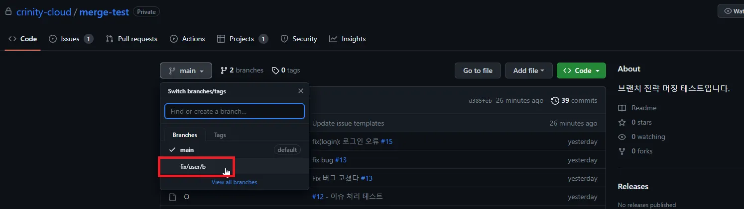 마스터 브랜치에 코드를 merge하기 위해서 Pull request를 날리자.