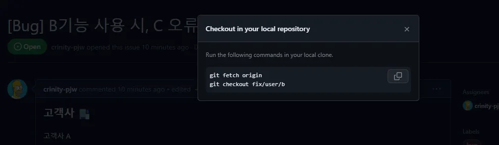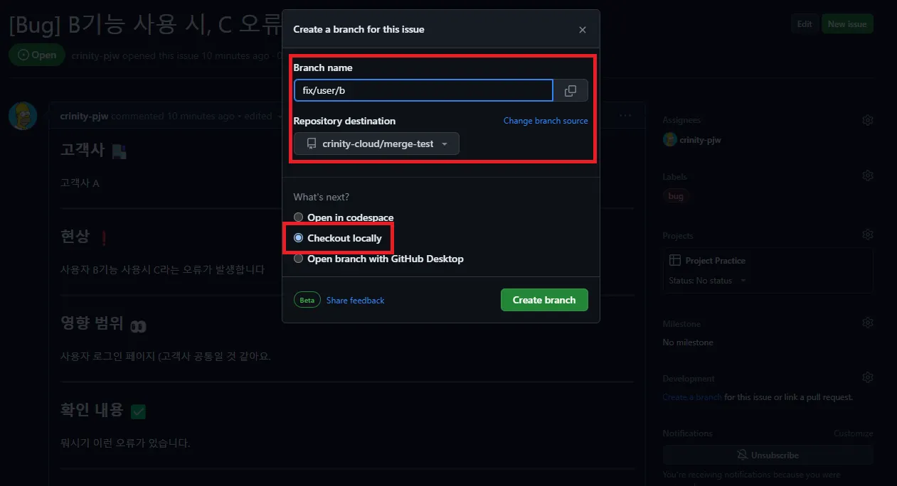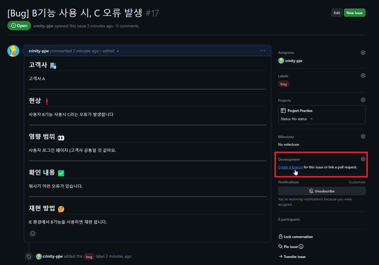 작성자는 GitHub Flow라는 브랜치 전략을 이용하기 때문에, 해당 이슈에서 브랜치를 생성하도록 합시다