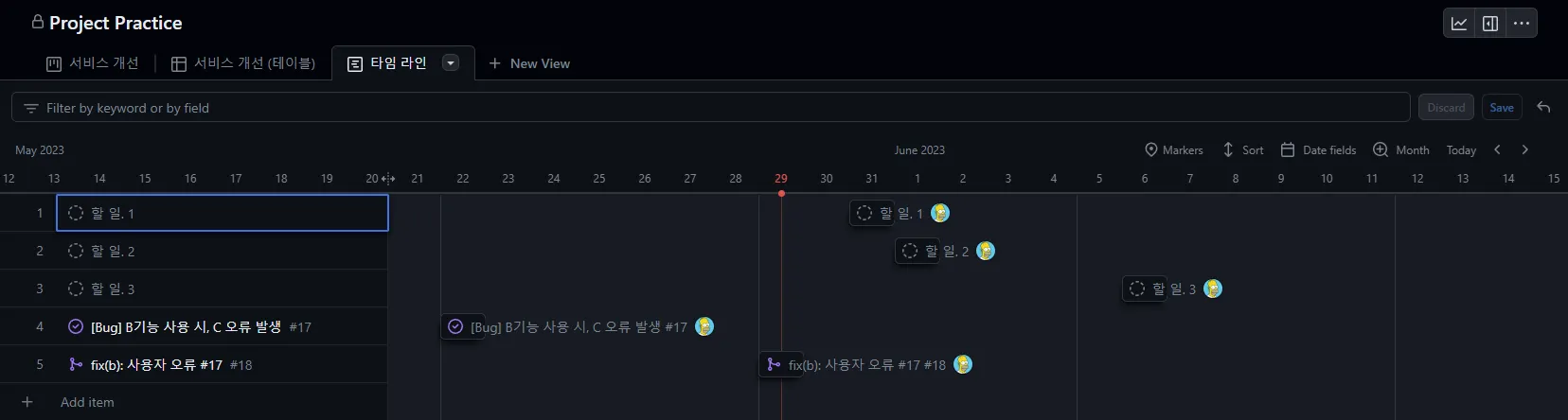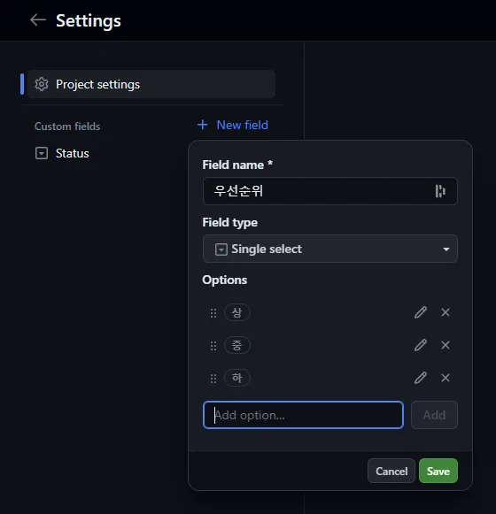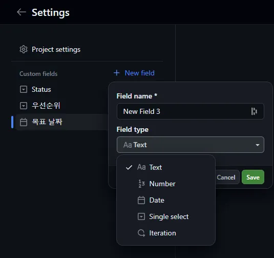 프로젝트에서 아이템 (할 일, 이슈)에 대하여 커스텀 필드 설정을 할 수 있다.