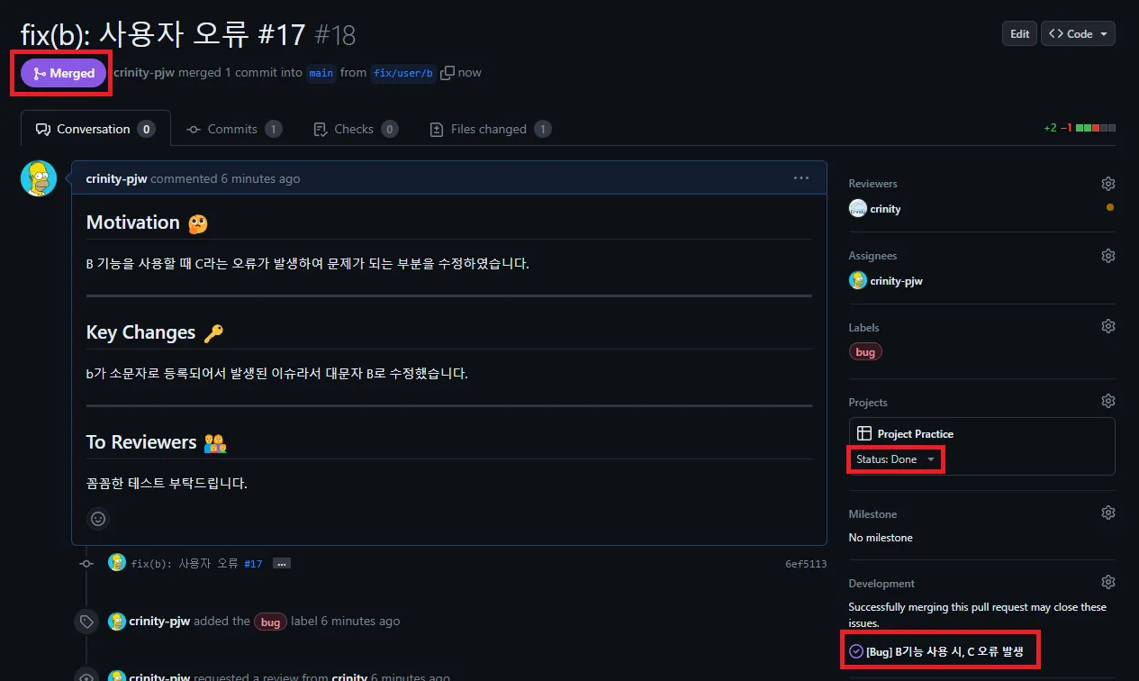 merge 가 된 이후 해당 PR의 우측을 살펴보면 Project 에 등록된 해당 아이템의 상태가 Done으로 변경되었고, 관련 Issue 또한 해결 됨을 확인 할 수 있다.
