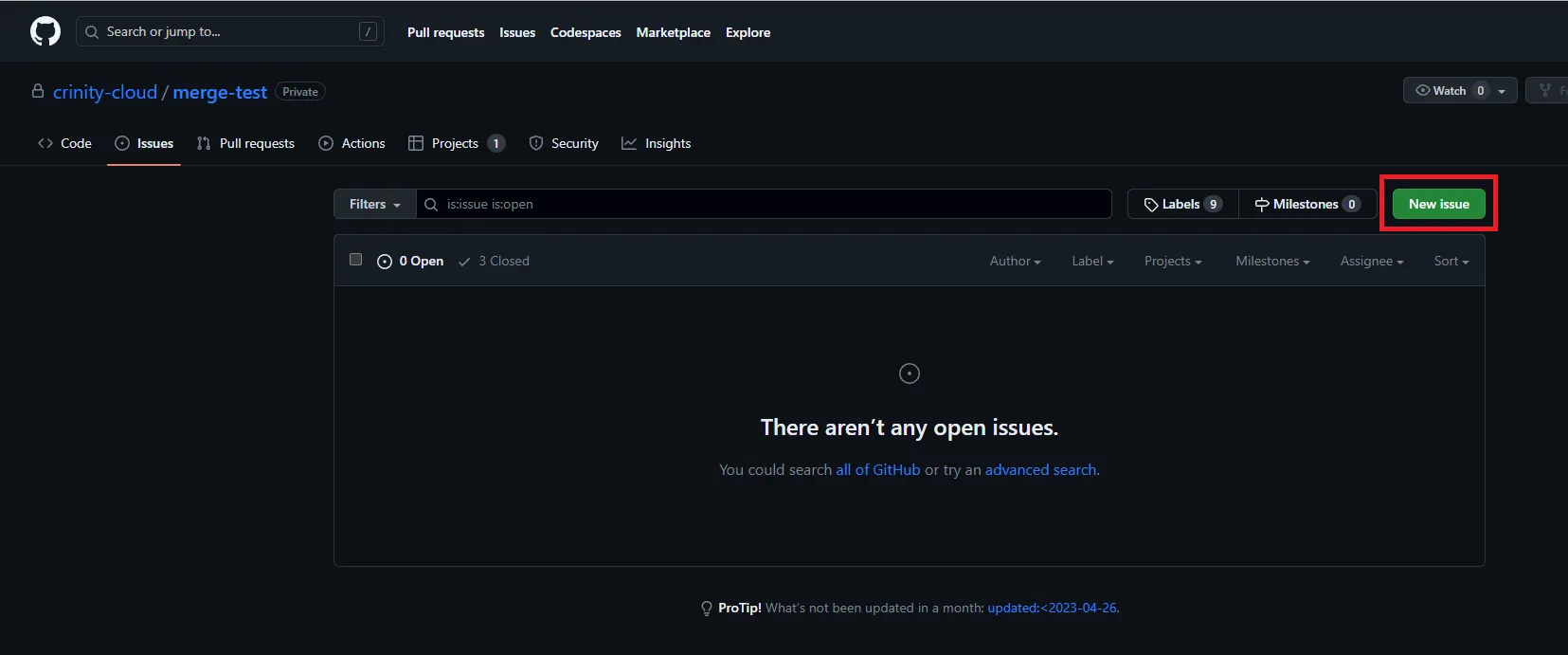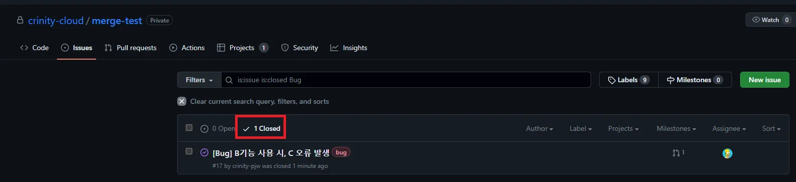 리파지토리 내 Issues 탭을 클릭 후 Closed를 선택하면 해당 이슈가 종료됨을 확인할 수있다.