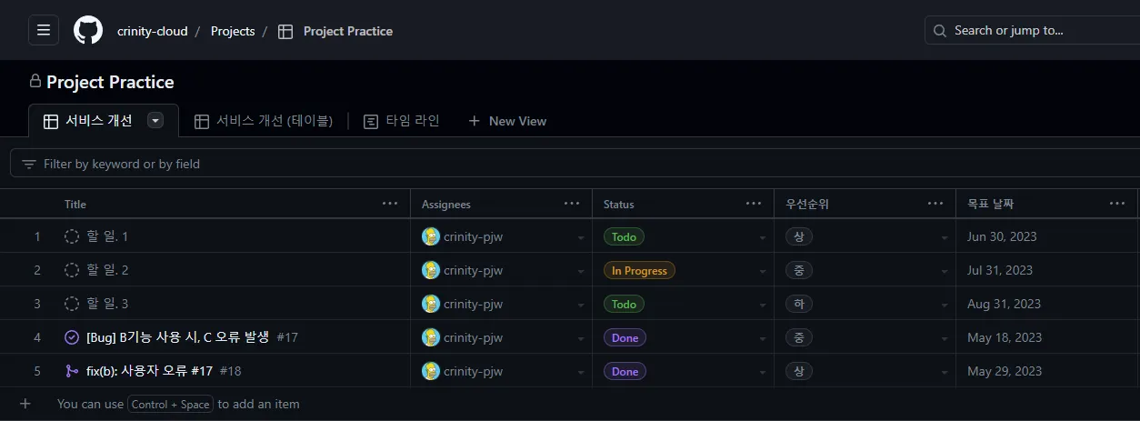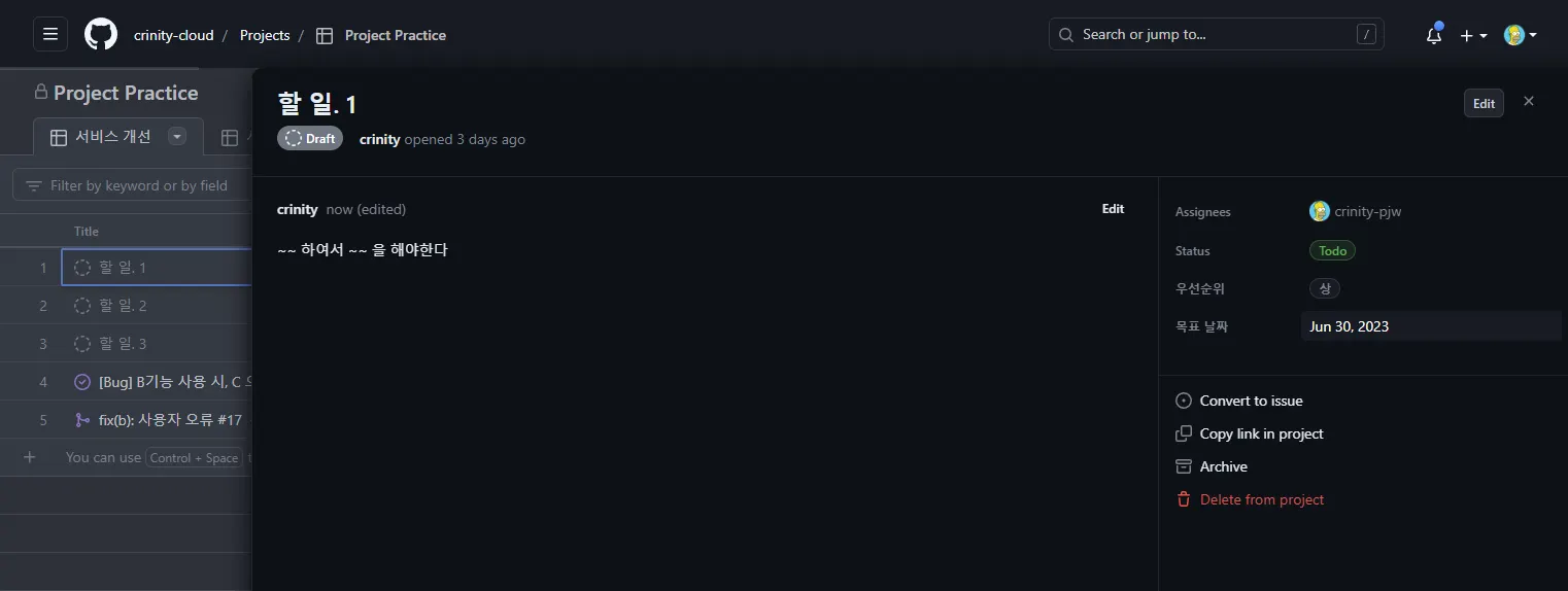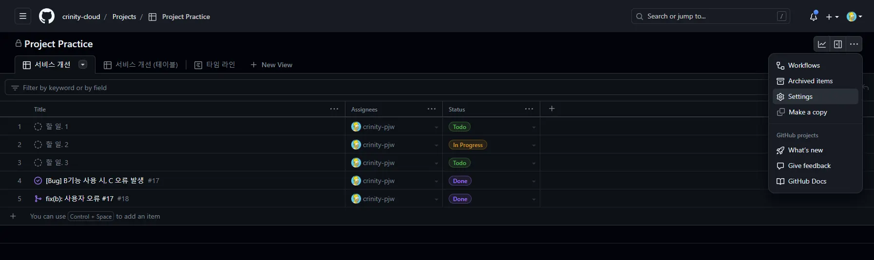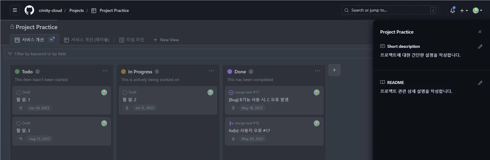 깃허브에서 제공하는 프로젝트 관리 기능으로써, 작업의 진척도 및 이슈 트래킹 등 프로젝트의 전반적인 상황을 한 눈에 볼 수 있습니다.