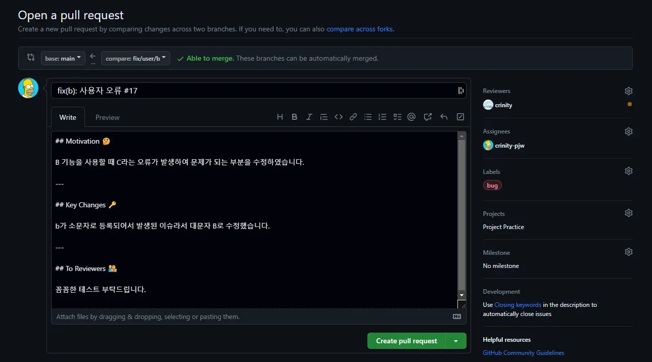 Reviewers 코드를 리뷰할 담당자를 지정 Assignees 작업자, 보통 본인을 지정 Labels 이슈 성격에 맞는 라벨을 선택 Projects 이슈가 등록되어 있는 프로젝트를 선택 내용을 모두 작성한 후 Create pull request 클릭