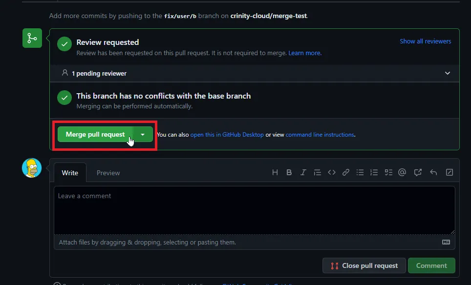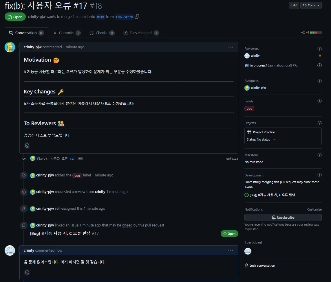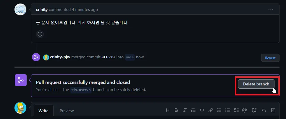 리뷰어는 변경된 코드 및 기능 테스트 이후 코멘트를 통하여 피드백을 준다. 문제가 있는 경우, 관련 코멘트를 남긴 후 해당 PR을 Close 한다. 문제가 없다면, merge를 해도 괜찮다는 코멘트를 남긴다. 이 때, 리뷰어가 merge를 해줘도 되지만, 본인의 코드의 대한 책임감을 가질 수 있게, 마스터 브랜치에 merge는 작업자 본인이 하도록 하자.