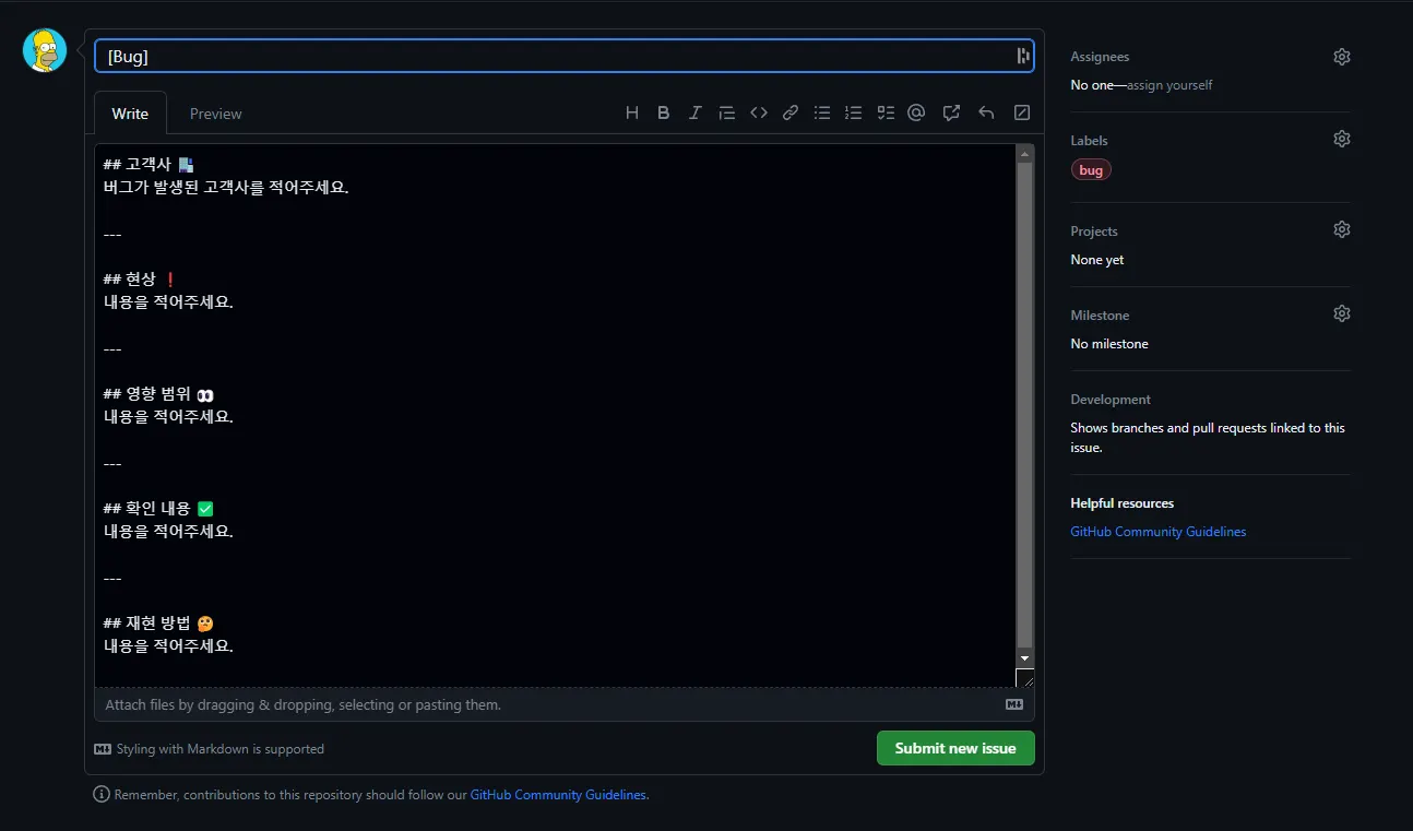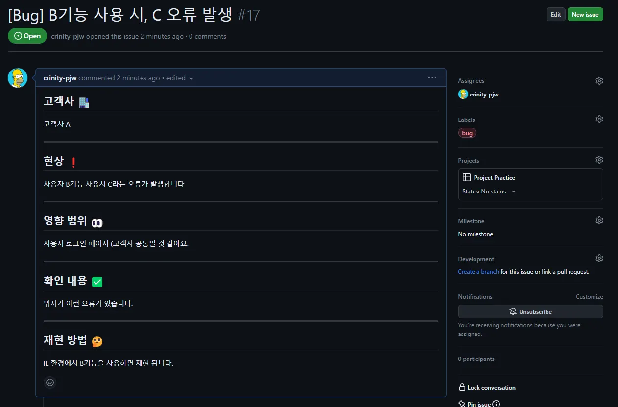 템플릿에 이슈에 대한 내용을 기입합니다. Assignees 의 경우 해당 이슈를 처리할 담당자를 의미합니다. 중요한 부분은 Projects 를 선택하는건데요, 해당 가이드에서는 Project Practice 를 선택하겠습니다. 내용을 모두 작성 후, Submit new issue 버튼을 클릭해주세요.