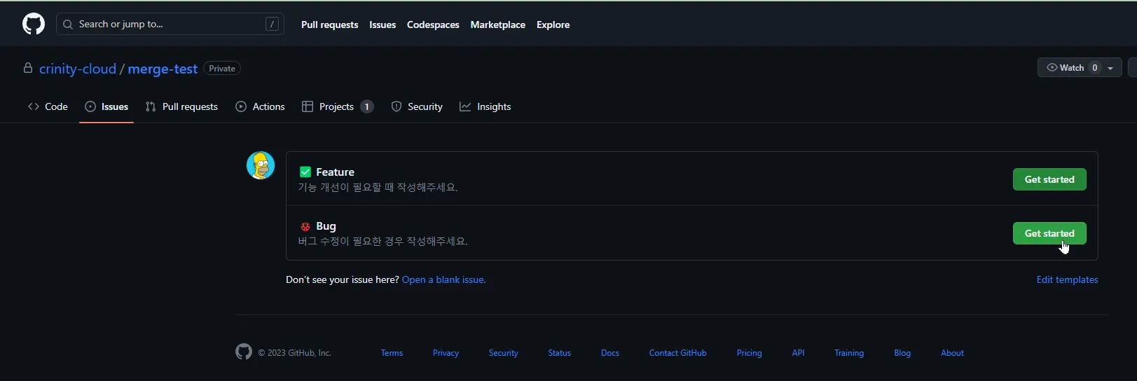 이슈 종류에 따라 기능 (Feature), 버그 (Bug) 템플릿 선택하여 Get started 클릭