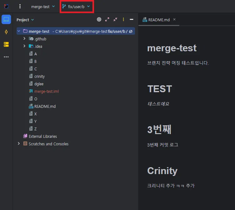 IDE에서 해당 프로젝트를 오픈하면, 신규 추가한 브랜치로 체크아웃이 되어 있는것을 확인할 수 있습니다.