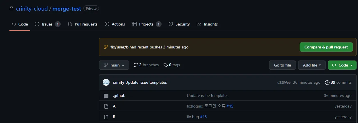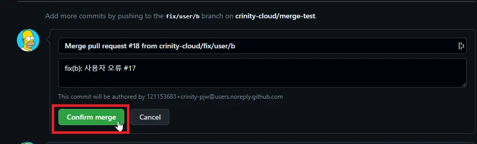 Merge pull reqestConfirm merge 이 때, 브랜치에서 수정한 코드와 마스터 브랜치의 코드가 충돌날 경우, merge를 진행 할 수 없고, 브랜치 코드 쪽에서 충돌이 나지 않게 수정 후 merge 하도록 하자