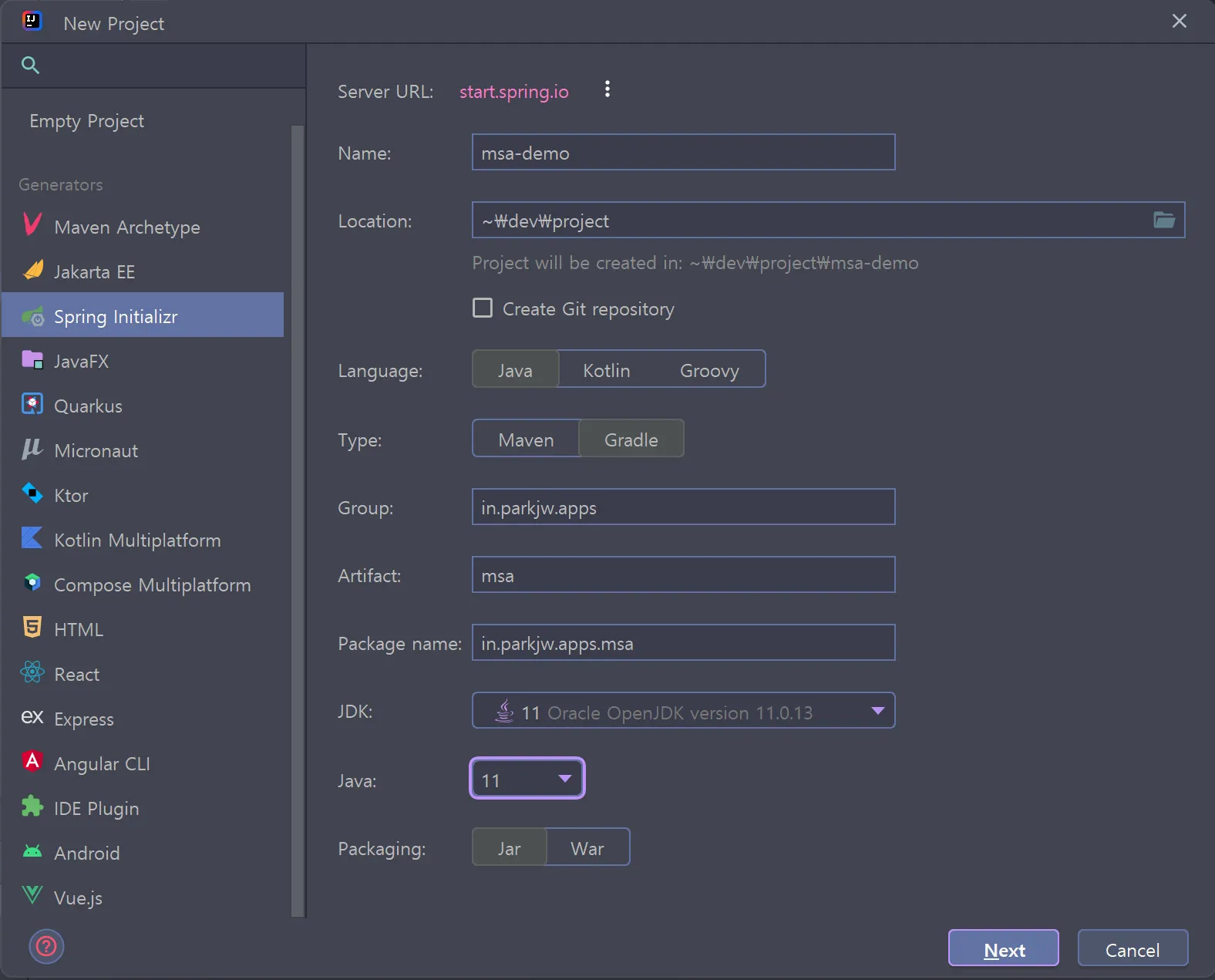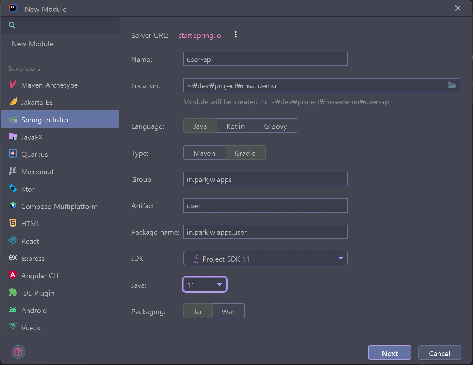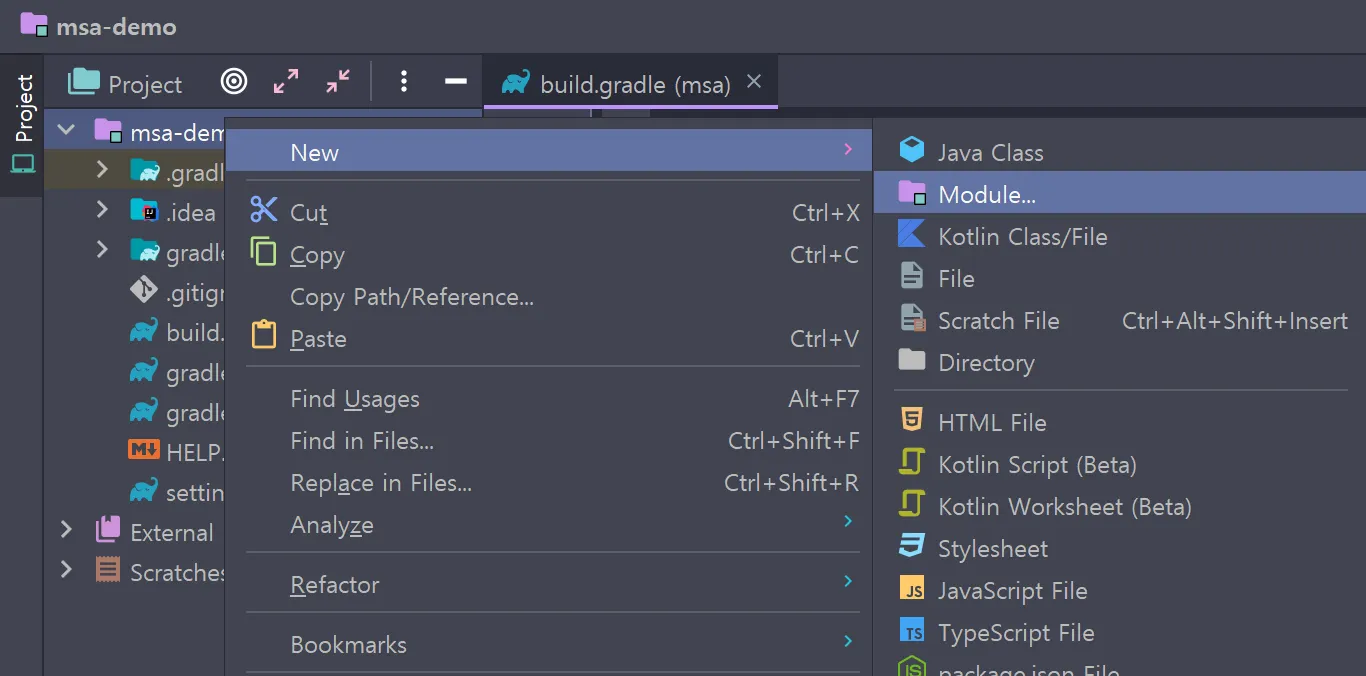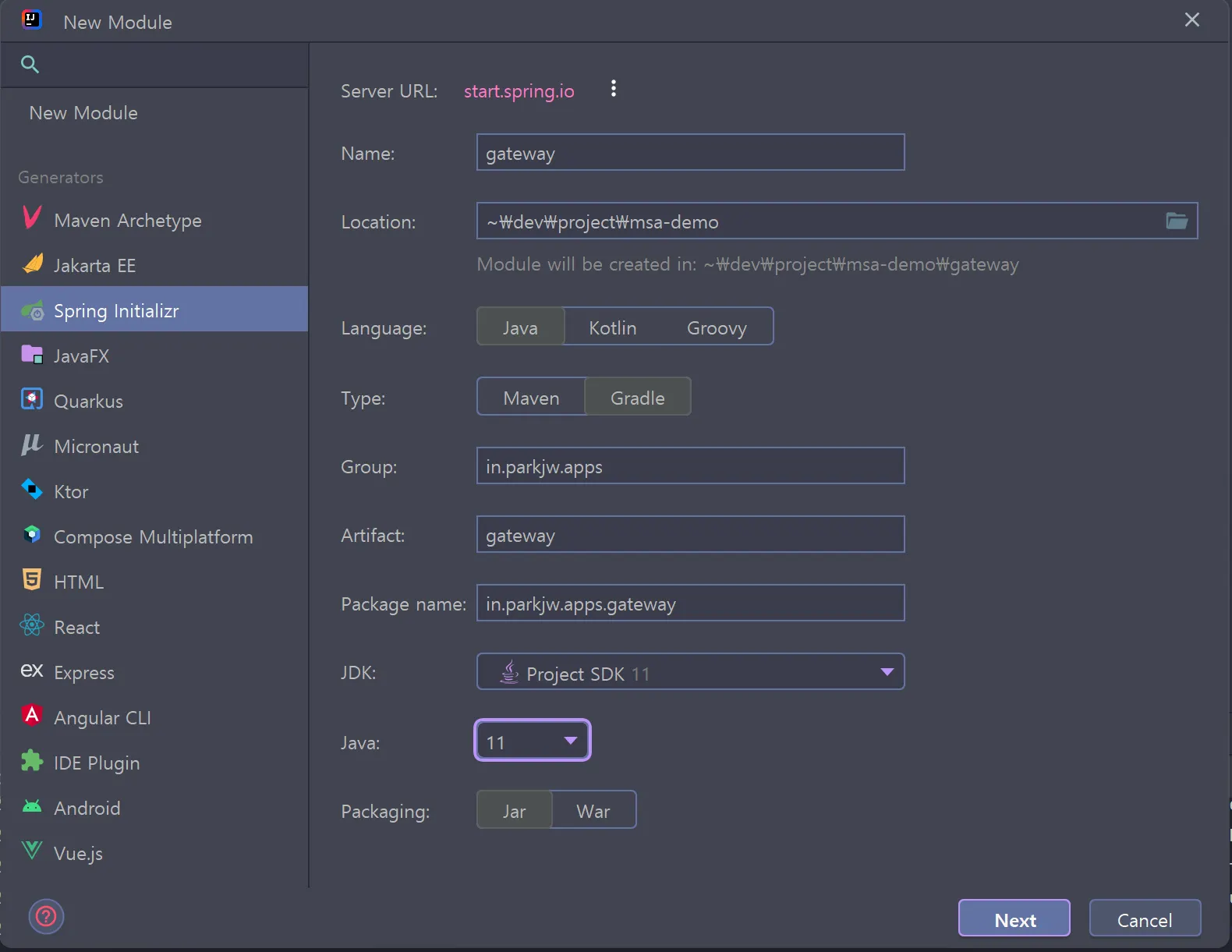 Step 1 : 모듈 추가 (Gateway의 경우 sub 모듈 범위로 관리 되지 않지만 편의상 모듈로 구성)