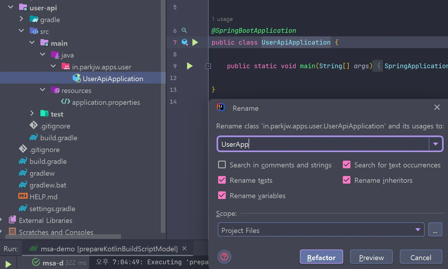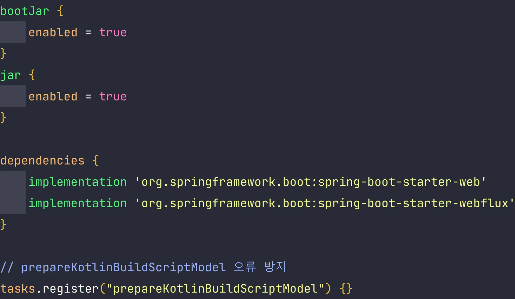 bootJar { enabled = true } jar { enabled = true } dependencies { implementation 'org.springframework.boot:spring-boot-starter-web' implementation 'org.springframework.boot:spring-boot-starter-webflux' } // prepareKotlinBuildScriptModel 오류 방지 tasks.register("prepareKotlinBuildScriptModel") {}