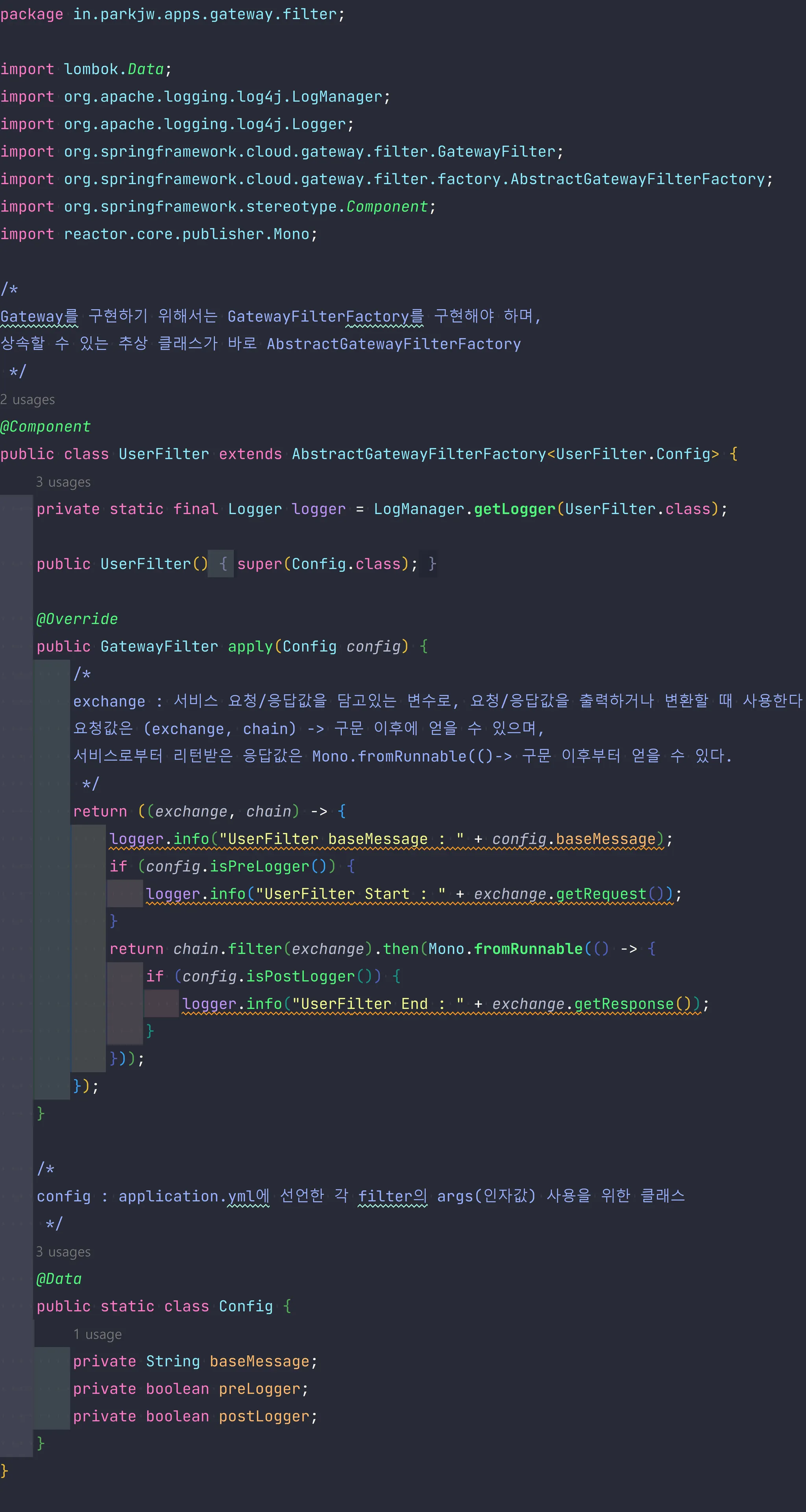 package in.parkjw.apps.gateway.filter; import lombok.Data; import org.apache.logging.log4j.LogManager; import org.apache.logging.log4j.Logger; import org.springframework.cloud.gateway.filter.GatewayFilter; import org.springframework.cloud.gateway.filter.factory.AbstractGatewayFilterFactory; import org.springframework.stereotype.Component; import reactor.core.publisher.Mono; /* Gateway를 구현하기 위해서는 GatewayFilterFactory를 구현해야 하며, 상속할 수 있는 추상 클래스가 바로 AbstractGatewayFilterFactory */ @Component public class UserFilter extends AbstractGatewayFilterFactory<UserFilter.Config> { private static final Logger logger = LogManager.getLogger(UserFilter.class); public UserFilter() { super(Config.class); } @Override public GatewayFilter apply(Config config) { /* exchange : 서비스 요청/응답값을 담고있는 변수로, 요청/응답값을 출력하거나 변환할 때 사용한다. 요청값은 (exchange, chain) -> 구문 이후에 얻을 수 있으며, 서비스로부터 리턴받은 응답값은 Mono.fromRunnable(()-> 구문 이후부터 얻을 수 있다. */ return ((exchange, chain) -> { logger.info("UserFilter baseMessage : " + config.baseMessage); if (config.isPreLogger()) { logger.info("UserFilter Start : " + exchange.getRequest()); } return chain.filter(exchange).then(Mono.fromRunnable(() -> { if (config.isPostLogger()) { logger.info("UserFilter End : " + exchange.getResponse()); } })); }); } /* config : application.yml에 선언한 각 filter의 args(인자값) 사용을 위한 클래스 */ @Data public static class Config { private String baseMessage; private boolean preLogger; private boolean postLogger; } }