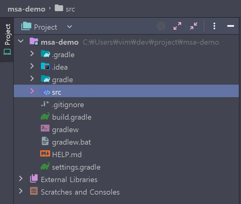 루트 프로젝트에서는 별도 코드를 작성하지 않고 하위 모듈만 관리하기 때문에 src 디렉토리는 삭제한다.