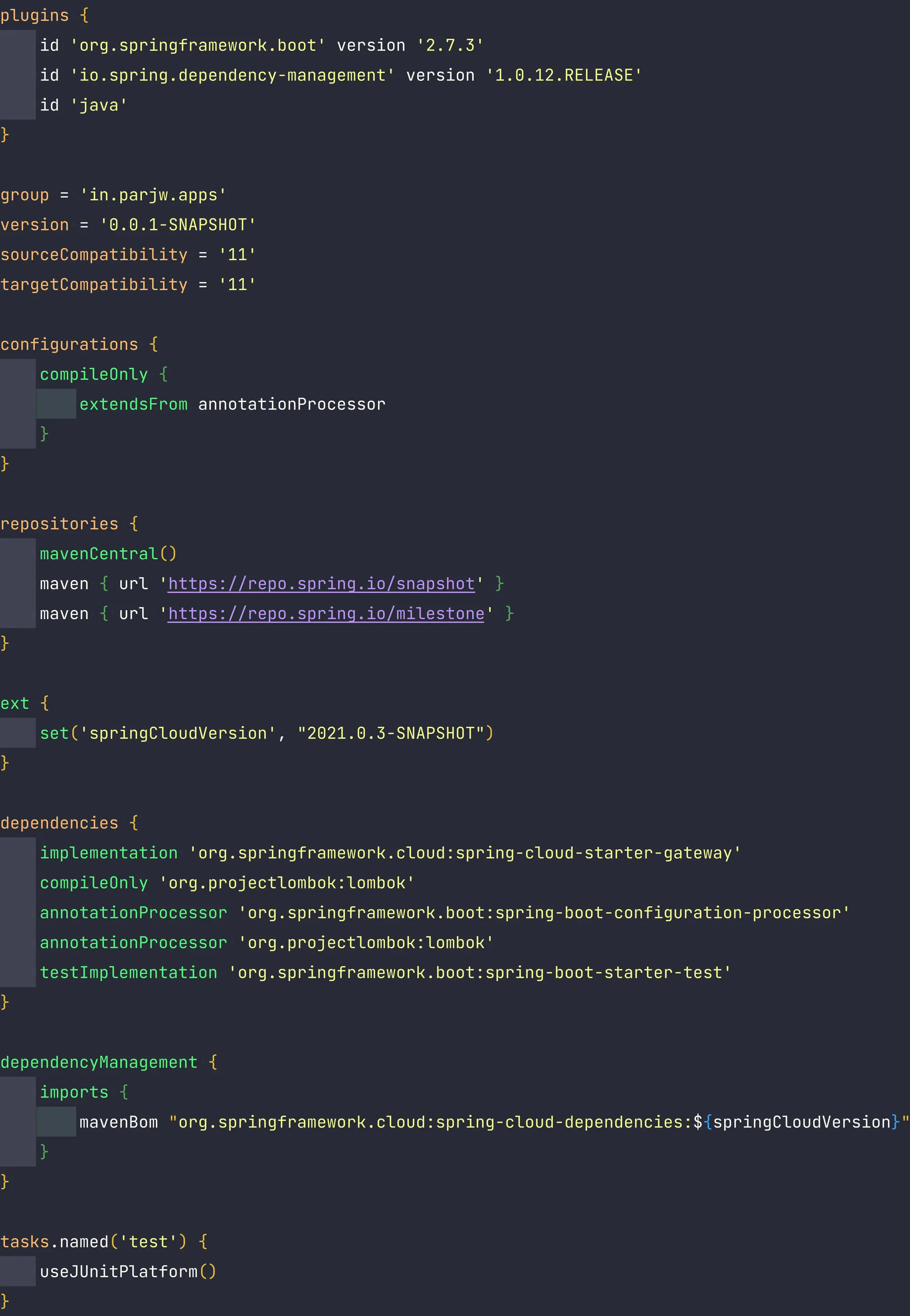 plugins { id 'org.springframework.boot' version '2.7.3' id 'io.spring.dependency-management' version '1.0.12.RELEASE' id 'java' } group = 'in.parjw.apps' version = '0.0.1-SNAPSHOT' sourceCompatibility = '11' targetCompatibility = '11' configurations { compileOnly { extendsFrom annotationProcessor } } repositories { mavenCentral() maven { url 'https://repo.spring.io/snapshot' } maven { url 'https://repo.spring.io/milestone' } } ext { set('springCloudVersion', "2021.0.3-SNAPSHOT") } dependencies { implementation 'org.springframework.cloud:spring-cloud-starter-gateway' compileOnly 'org.projectlombok:lombok' annotationProcessor 'org.springframework.boot:spring-boot-configuration-processor' annotationProcessor 'org.projectlombok:lombok' testImplementation 'org.springframework.boot:spring-boot-starter-test' } dependencyManagement { imports { mavenBom "org.springframework.cloud:spring-cloud-dependencies:${springCloudVersion}" } } tasks.named('test') { useJUnitPlatform() }