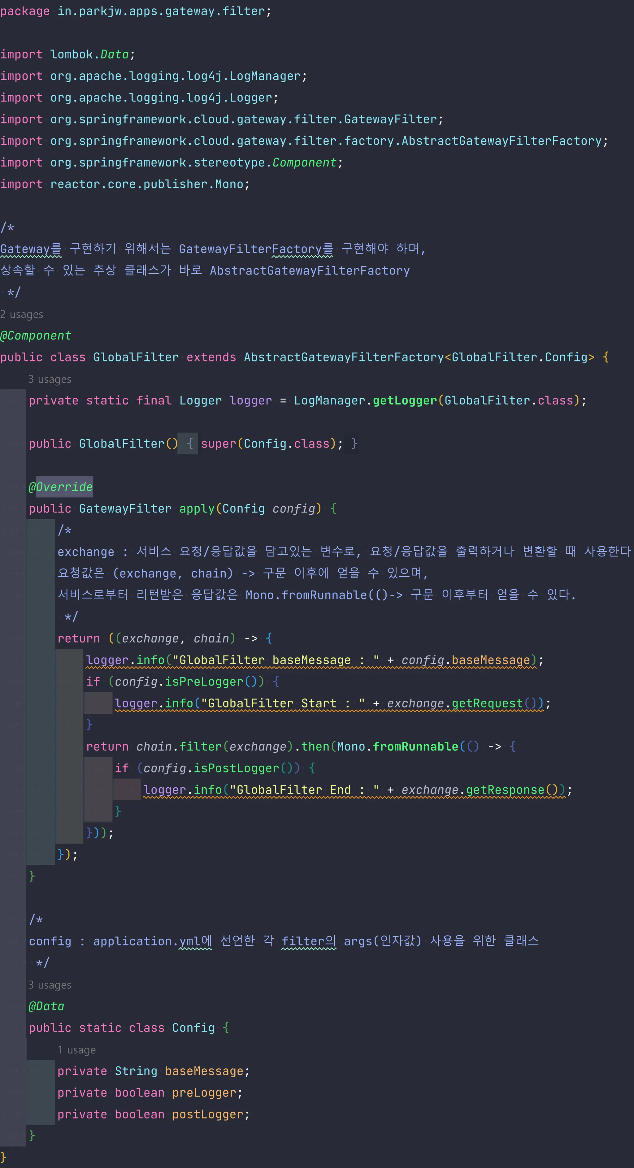 package in.parkjw.apps.gateway.filter; import lombok.Data; import org.apache.logging.log4j.LogManager; import org.apache.logging.log4j.Logger; import org.springframework.cloud.gateway.filter.GatewayFilter; import org.springframework.cloud.gateway.filter.factory.AbstractGatewayFilterFactory; import org.springframework.stereotype.Component; import reactor.core.publisher.Mono; /* Gateway를 구현하기 위해서는 GatewayFilterFactory를 구현해야 하며, 상속할 수 있는 추상 클래스가 바로 AbstractGatewayFilterFactory */ @Component public class GlobalFilter extends AbstractGatewayFilterFactory<GlobalFilter.Config> { private static final Logger logger = LogManager.getLogger(GlobalFilter.class); public GlobalFilter() { super(Config.class); } @Override public GatewayFilter apply(Config config) { /* exchange : 서비스 요청/응답값을 담고있는 변수로, 요청/응답값을 출력하거나 변환할 때 사용한다. 요청값은 (exchange, chain) -> 구문 이후에 얻을 수 있으며, 서비스로부터 리턴받은 응답값은 Mono.fromRunnable(()-> 구문 이후부터 얻을 수 있다. */ return ((exchange, chain) -> { logger.info("GlobalFilter baseMessage : " + config.baseMessage); if (config.isPreLogger()) { logger.info("GlobalFilter Start : " + exchange.getRequest()); } return chain.filter(exchange).then(Mono.fromRunnable(() -> { if (config.isPostLogger()) { logger.info("GlobalFilter End : " + exchange.getResponse()); } })); }); } /* config : application.yml에 선언한 각 filter의 args(인자값) 사용을 위한 클래스 */ @Data public static class Config { private String baseMessage; private boolean preLogger; private boolean postLogger; } }