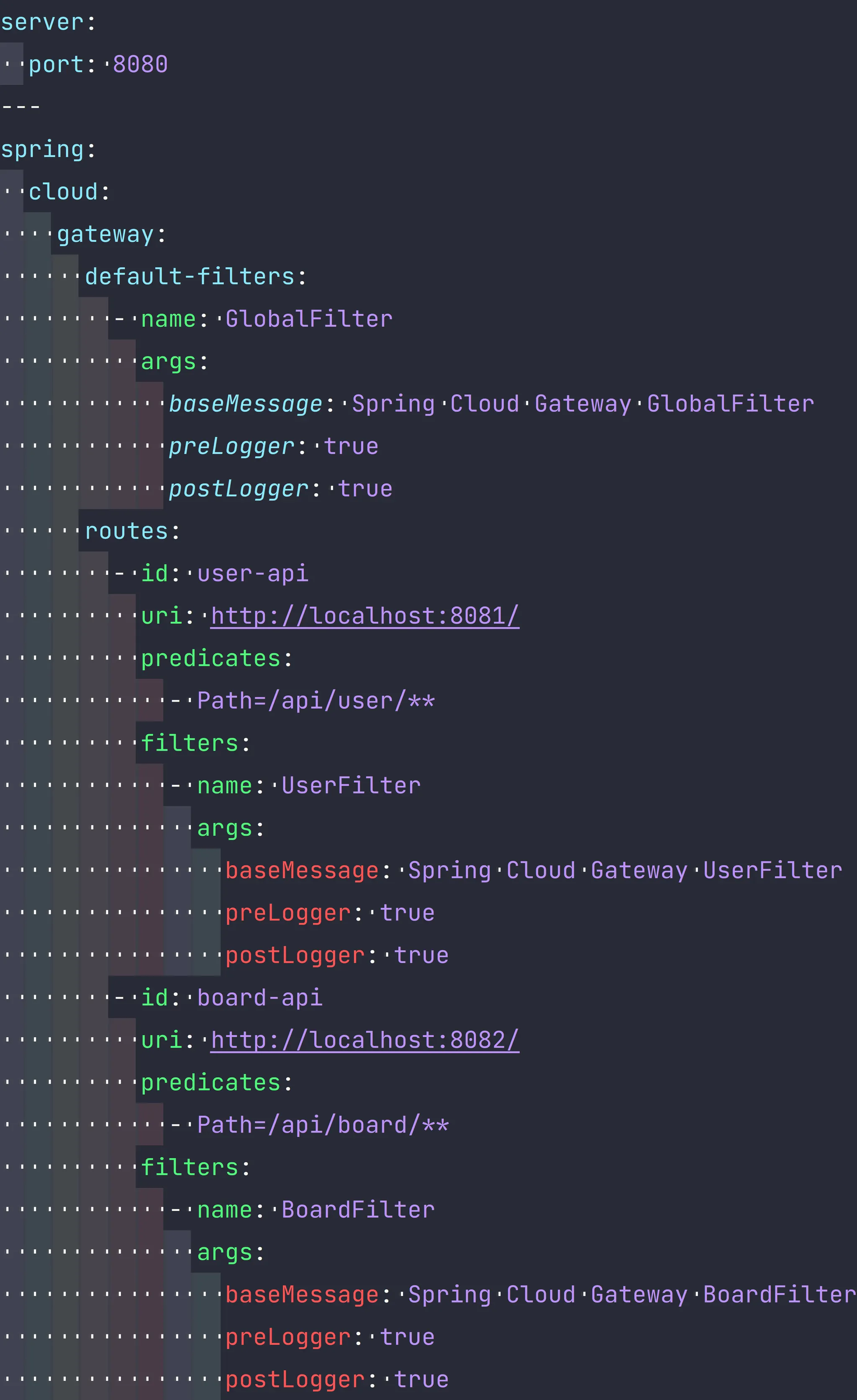 server: port: 8080 --- spring: cloud: gateway: default-filters: - name: GlobalFilter args: baseMessage: Spring Cloud Gateway GlobalFilter preLogger: true postLogger: true routes: - id: user-api uri: http://localhost:8081/ predicates: - Path=/api/user/** filters: - name: UserFilter args: baseMessage: Spring Cloud Gateway UserFilter preLogger: true postLogger: true - id: board-api uri: http://localhost:8082/ predicates: - Path=/api/board/** filters: - name: BoardFilter args: baseMessage: Spring Cloud Gateway BoardFilter preLogger: true postLogger: true