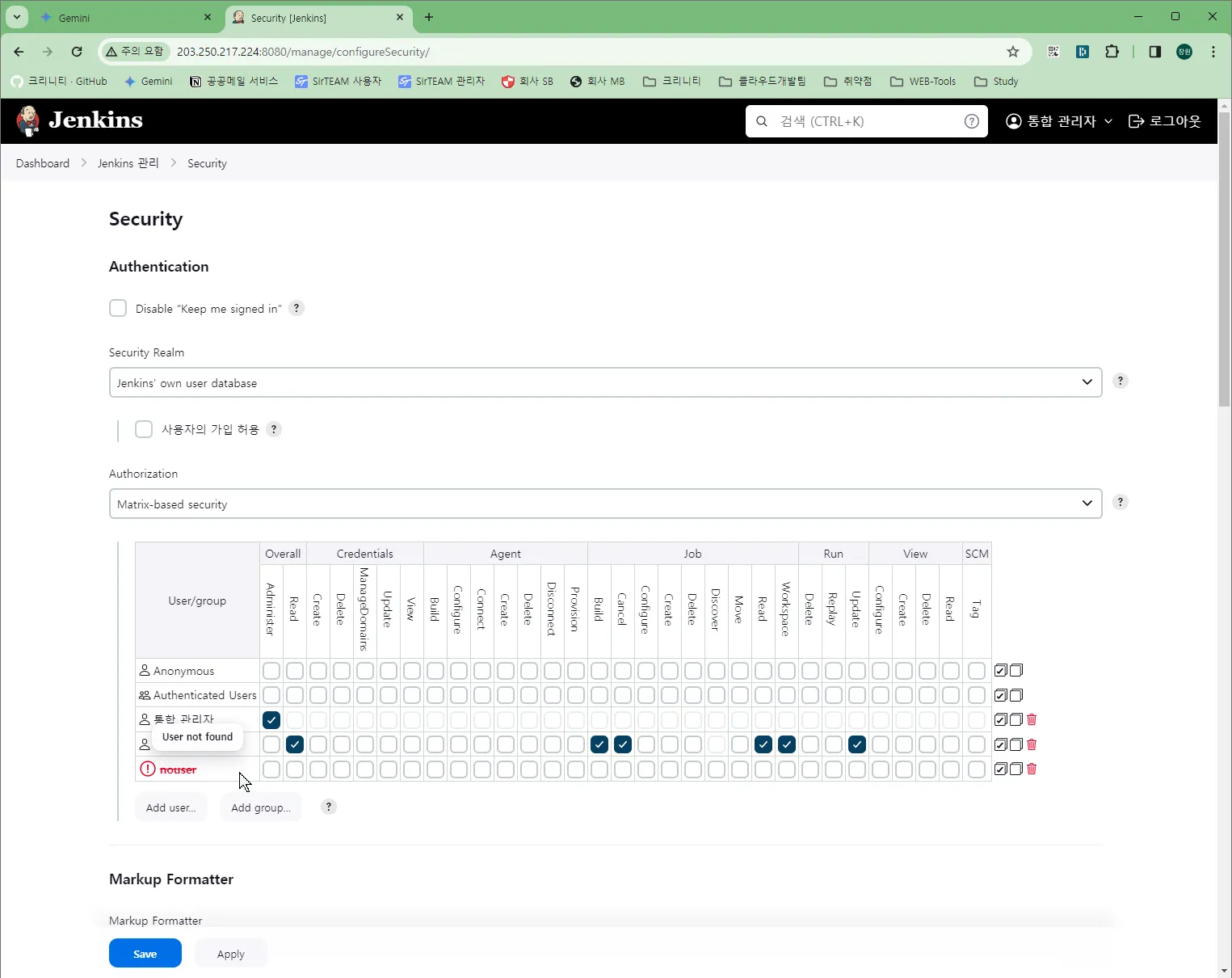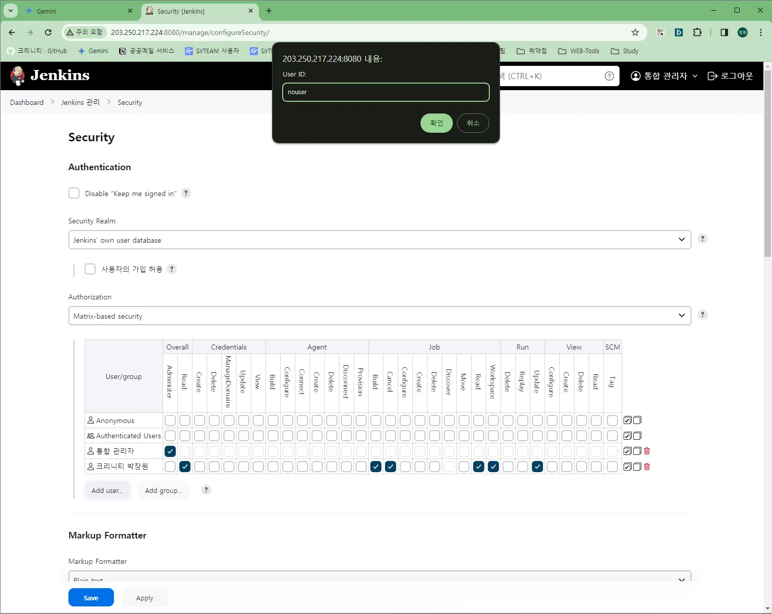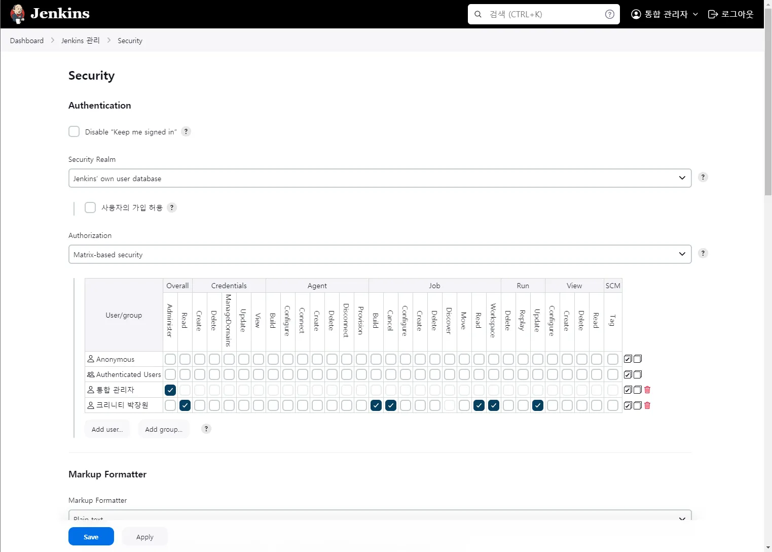 관리자 계정과 젠킨스의 사용자 추가에서 생성한 사용자 계정의 권한을 설정해보겠습니다.