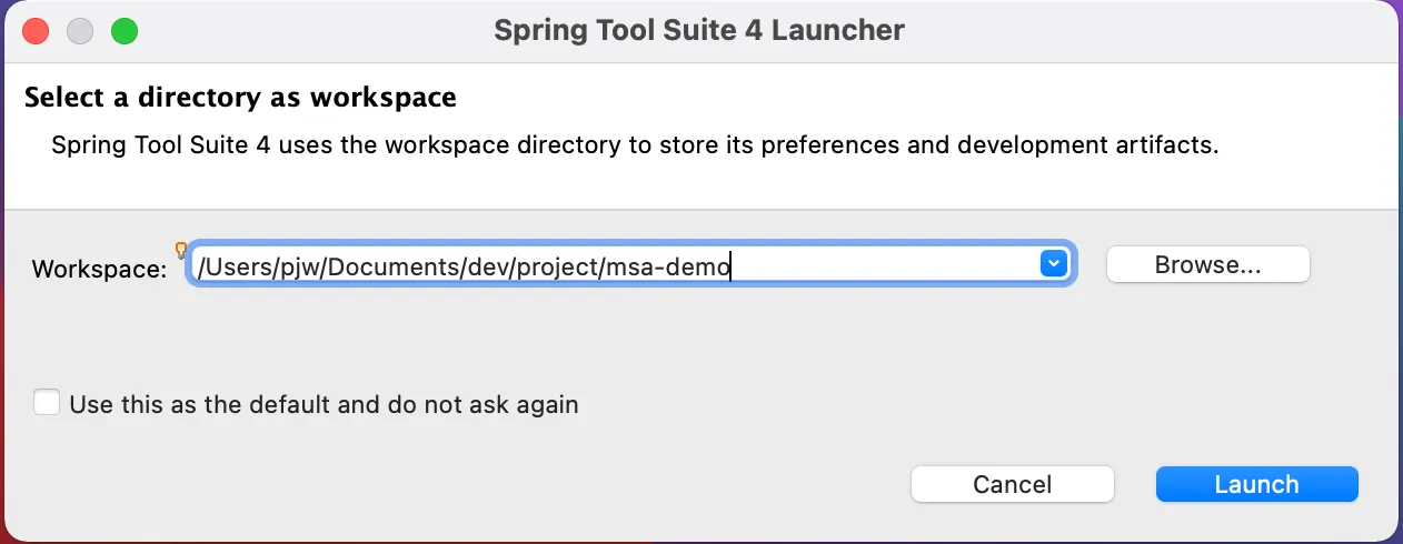 프로젝트가 위치 할 워크스페이스 경로를 입력한 후 Launch를 클릭한다.
