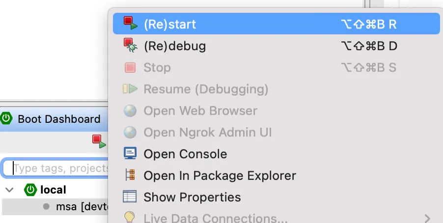 Boot Dashboard > 프로젝트 우클릭 > start 클릭.