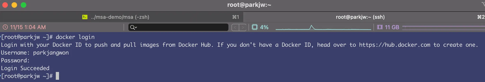 # 최초 로그인 시 dockerhub 가입시 입력한 name을 입력하고,