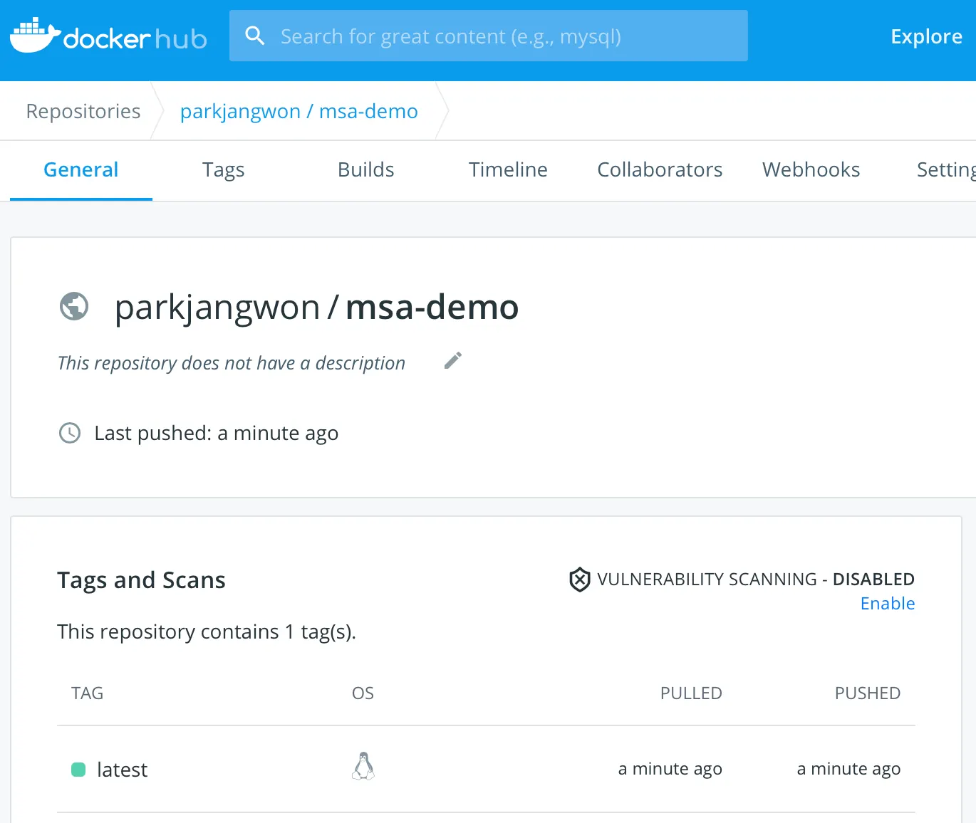 이전과 다르게 로컬 이미지는 없고, Docker Hub 리파지토리에서