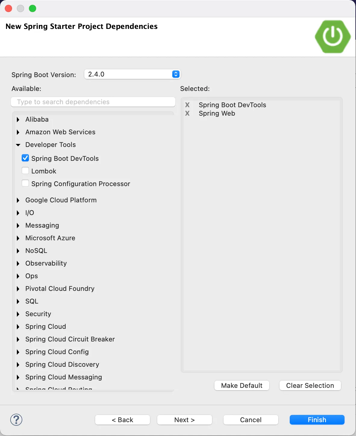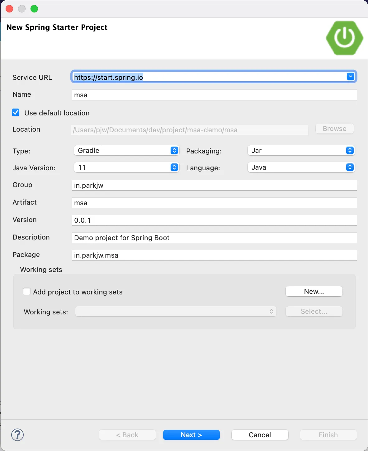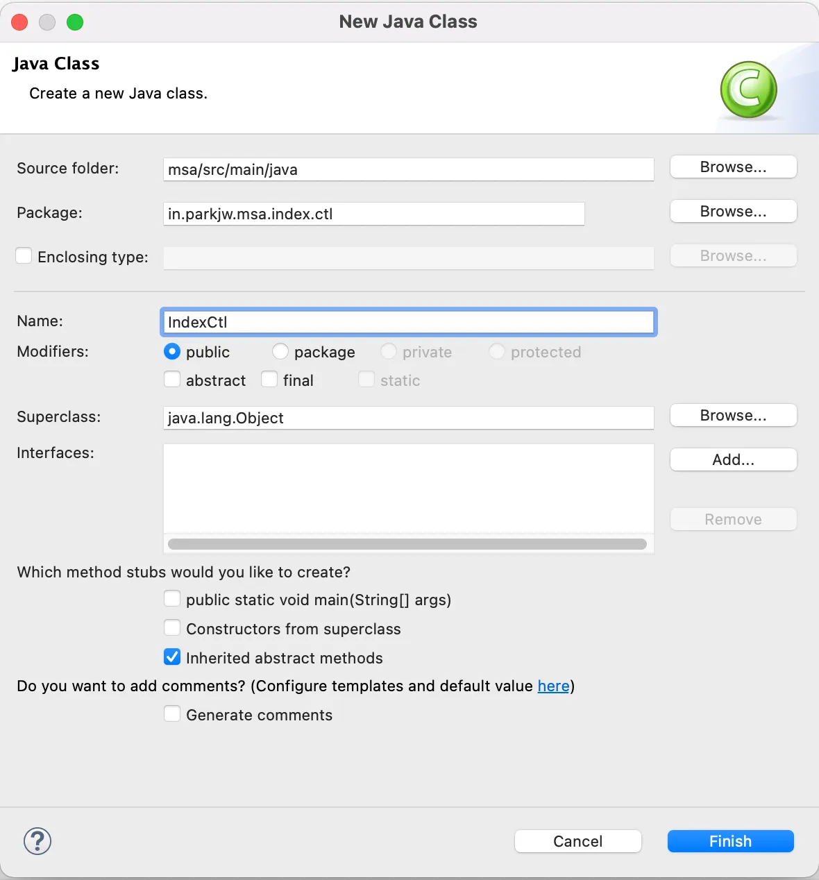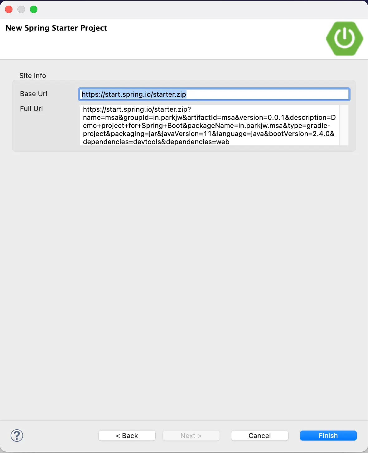 해당 포스팅에서는 단순한 API 하나만 구현할 것이기 때문에 이정도만 선택 후, Finsh 클릭.