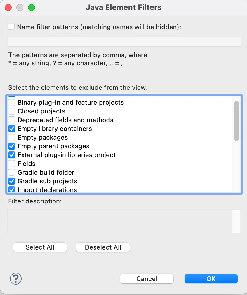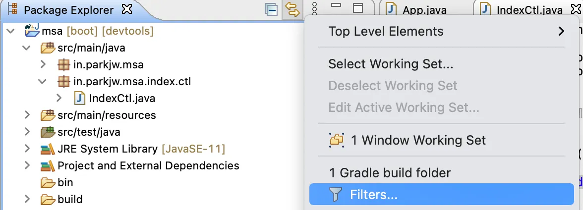 만약 Package Explorer에 build 디렉토리가 보이지 않는다면 점3개 아이콘 > Filter를 클릭한다.