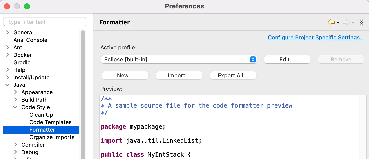 만약 들여쓰기를 Tab으로 변경하고 싶다면, Formatter 설정으로 돌아가서 Edit 하면 된다.