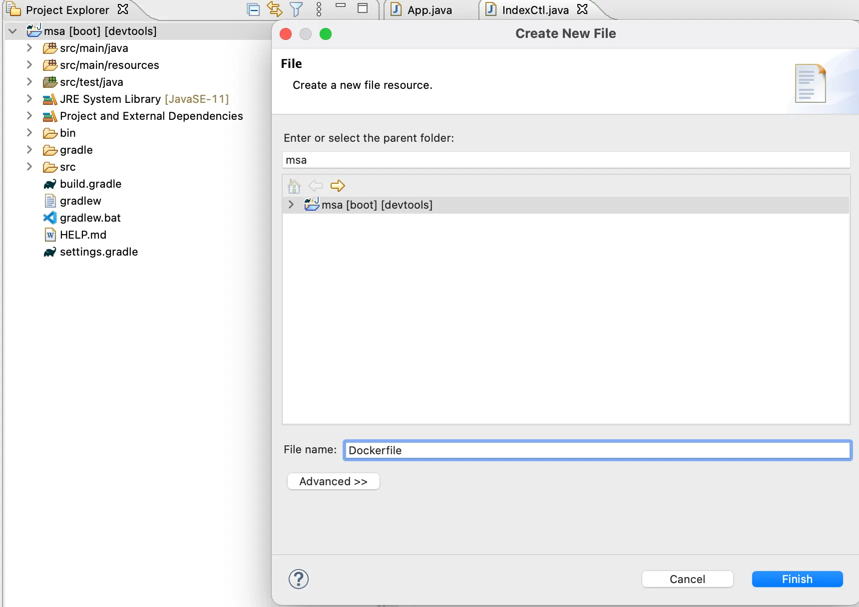 프로젝트 최상단 경로에 'Dockerfile'이름으로 파일을 생성한다.