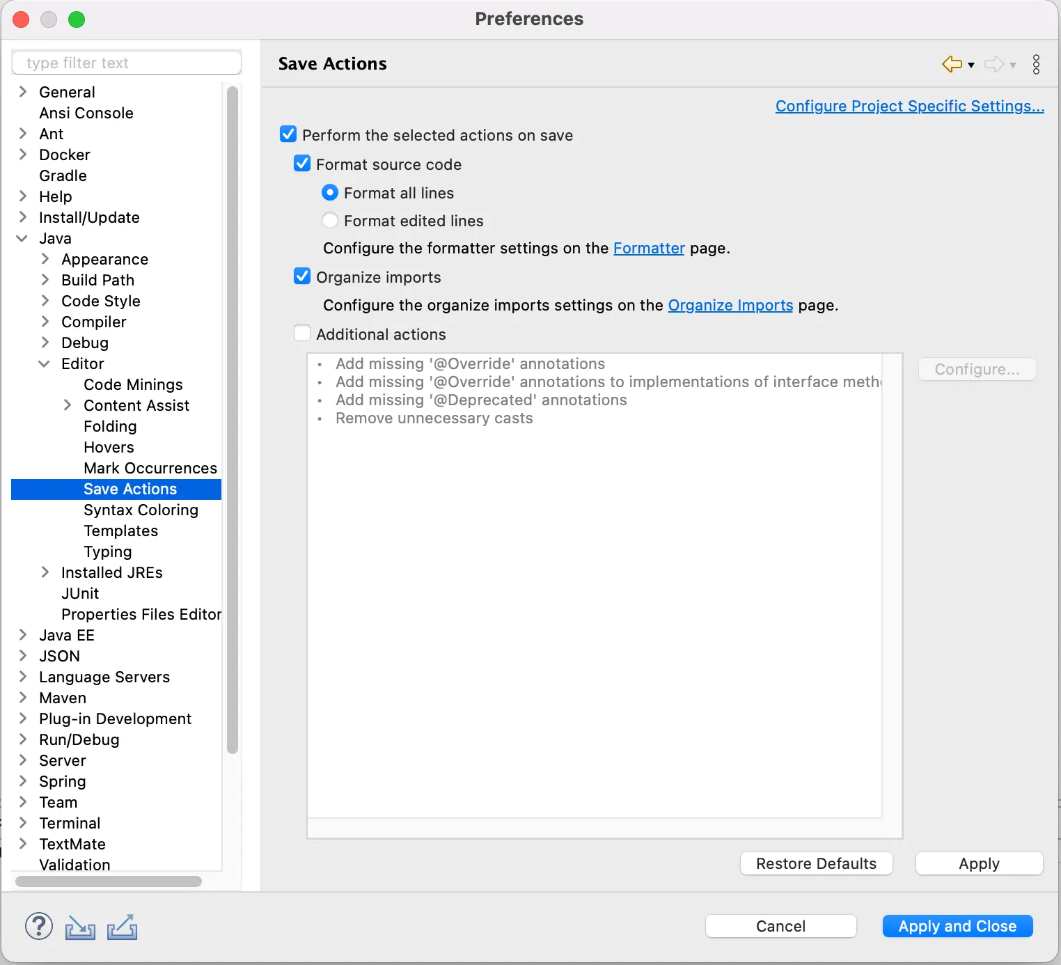 Java > Editor > Save Actions > 화면과 같이 체크 후 Apply and Close 클릭.