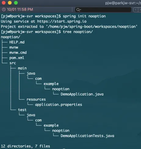 spring init 프로젝트명 을 입력하면 순식간에 기본 템플릿으로 프로젝트가 생성된다.