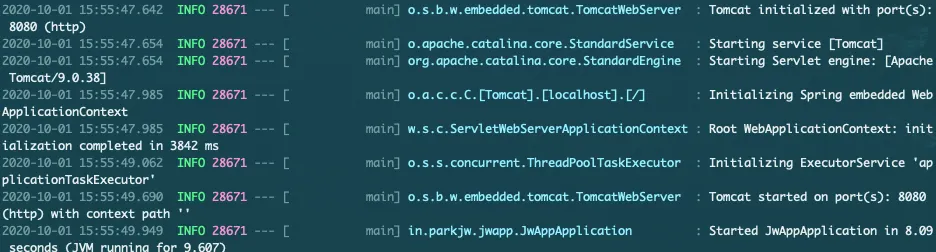 Log를 보았을 때 Application이 8080(Spring Boot 기본 port)port로 올라왔다는 것을 확인 할 수 있다.