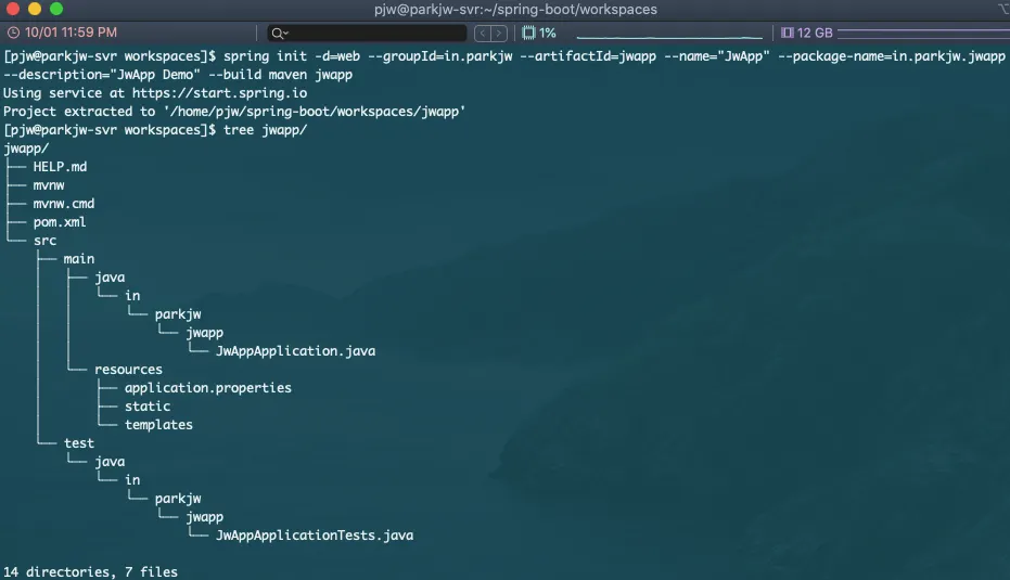 spring init -d=web --groupId=in.parkjw --artifactId=jwapp --name="JwApp" --package-name=in.parkjw.jwapp --description="JwApp Demo" --build maven jwapp