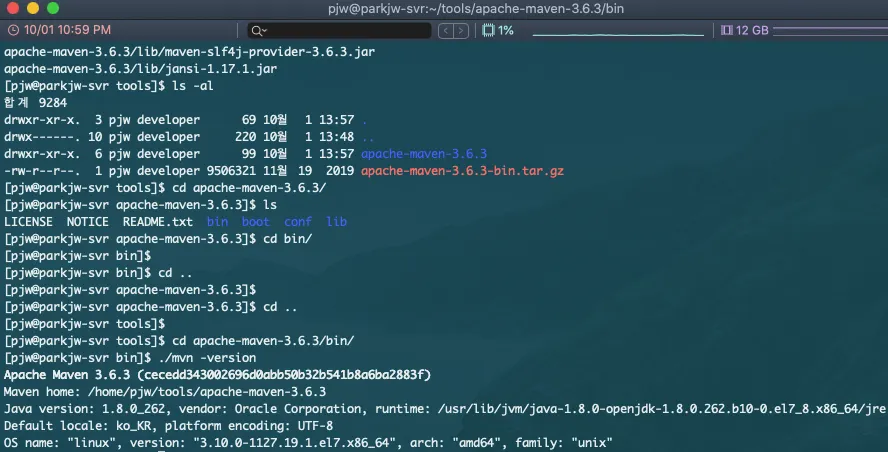 ~bin 디렉토리 아래에 있는 mvn 실행 파일을 실행 시켜 정상 동작하는지 확인한다.