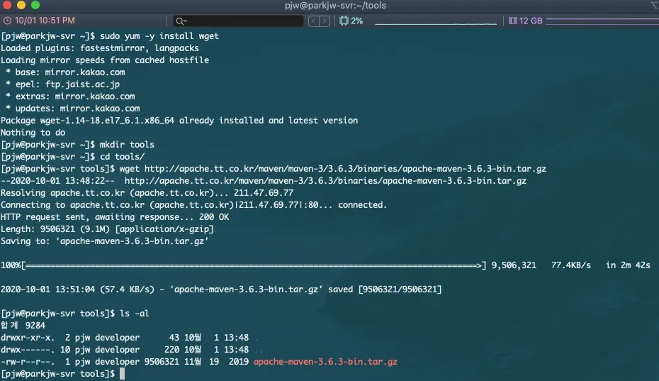 wget <http://apache.tt.co.kr/maven/maven-3/3.6.3/binaries/apache-maven-3.6.3-bin.tar.gz>